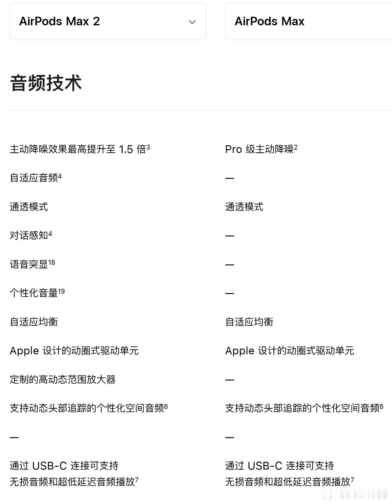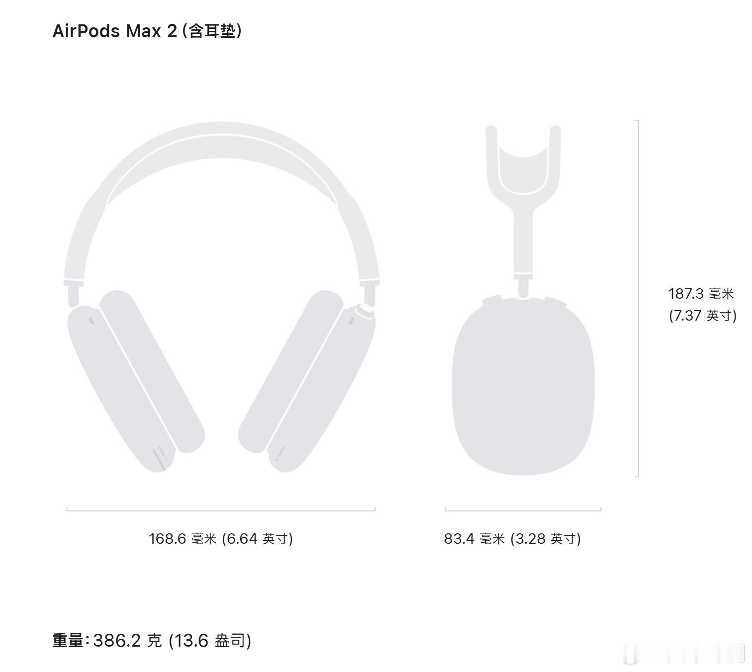 AirPods Max2 官网上架,外观造型和上代差不多,升级H2芯片,降噪能力进一步提升,支持自适应通透模式,价格3999元~不过重量完全没有变化,上代386.2g这代还是386.2g~