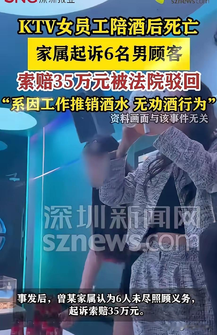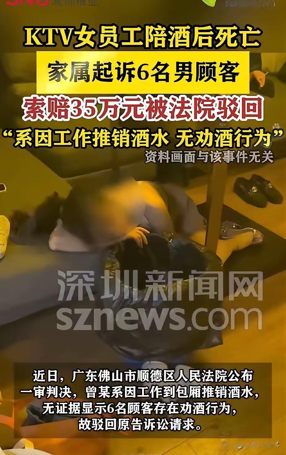 广东佛山,KTV女员工走进包厢给6名男顾客推销酒水,礼貌性的喝了几口后,便在包厢休息。次日凌晨一点多,酒局散场,男子们都各自回家,女子还待在包厢。下午5点多,有人发现女子竟然在包厢沙发上一动不动,不幸死亡。这下,女子家属不干了,他们认为,那6个男子没有尽到照顾义务,一纸诉状告上法庭,要求赔偿35万。 2024年3月18日晚,广东佛山顺德一家娱乐场所内,包厢里迎来6名男性顾客,众人唱歌饮酒,开启夜间休闲模式。 包厢门被推开,一名女性酒水推销人员进入,按照岗位规范,她与顾客进行礼节性饮酒互动,完成服务后便留在包厢休息,未随顾客离开。 夜色渐深,凌晨一点多,6名顾客结束消费、结账后相继离场,返回各自住处。此时,女性工作人员仍留在包厢内,既未跟从顾客离开,也未向场所同事反馈自身状态,包厢陷入寂静。 凌晨两点半,保洁人员按排班进入V06包厢清洁,看到女子独自坐在沙发上哭泣,神情落寞。 保洁人员习惯了娱乐场所里饮酒后的情绪波动,未过多询问,也未向管理层报备异常,完成清洁后便退出包厢,继续其他区域工作,这也是事发前最后一次有人留意到她的状态。 从凌晨到下午,包厢门始终未被开启,无人关注内部情况。3月19日下午五点多,工作人员例行检查包厢设施,推开门后发现女子躺在沙发上一动不动,呼喊、触碰均无反应。 工作人员立即拨打急救与报警电话,医护人员赶到后,经专业检查确认其已无生命体征,年轻生命就此消逝。 女子离世的消息传来,家人陷入巨大悲痛。梳理事发经过后,家属认为当晚同处包厢的6名男性顾客,作为共同在场人员,未履行照顾与救助义务,导致女子错失救治时机,应承担相应责任。 随后,家属整理监控记录、证人证言等证据,将6名顾客起诉至法院,要求连带赔偿35万元。案件曝光后迅速引发全网关注,共同饮酒责任、场所安全保障等话题成为讨论焦点。 法院受理后,结合监控视频、人员询问笔录、场所运营记录等全面核查。审理中明确,6名顾客与女子仅为消费者与服务人员关系,无亲友等特殊关联,无证据证明存在劝酒、灌酒等过错行为; 顾客离场时,女子未表现明显身体异常,众人无法预见后续危险,女子的死亡结果与顾客消费行为无直接法律因果关系。最终,法院依法驳回家属诉讼请求,6名顾客无需承担赔偿责任。 判决一出,网友观点分歧显著。一部分网友对家属表示共情,认为即便无法律强制义务,众人同处包厢饮酒,看到女子情绪低落却未多加留意,最终酿成悲剧,难免让人觉得惋惜,在道德层面或许该多一份善意关怀。 另一部分网友坚定支持法院判决,认为法律责任不能被道德绑架。6人只是普通消费者,无过错行为,正常离场后无需为女子后续意外买单,若强行追责,会给正常消费行为带来不必要压力,破坏公平规则。 还有网友将目光投向娱乐场所管理,指出核心问题在场所方。员工在岗期间出现异常,保洁人员发现女子哭泣却不报备,管理层长时间未巡查包厢,安全保障义务落实不到位,才是悲剧的重要诱因,呼吁场所完善管理机制,筑牢安全防线。 此外,不少网友关注服务行业职场风险,感慨酒水推销岗位的工作压力,呼吁行业规范服务流程,保障基层从业者的人身安全,避免让职场应酬变成生命陷阱。 这起悲剧让大众清晰看到人情道义与法律责任的边界。法律坚守事实与证据,不纵容过错,也不强加无责赔偿;而生活中,人与人之间多一份细心关注,或许就能避免无法挽回的遗憾。案件的判决与讨论,也为公共场所安全保障、行业规范运营敲响了警钟。 对此,你们有什么看法,欢迎评论留言~