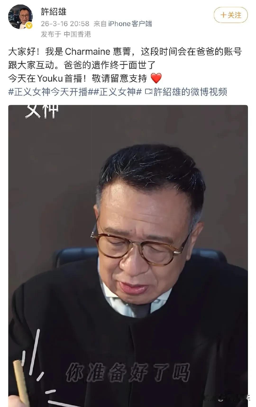 许绍雄女儿,深夜发文! 3月16日晚,不少守着手机的网友突然刷到一条动态——许绍雄的社交账号更新了!那一瞬间,很多人还以为是自己眼花,或者“欢喜哥”要复出了。 结果点开一看,破防了。发文的是女儿许惠菁,她接手了爸爸的账号,宣布许绍雄的遗作《正义女神》在优酷正式上线:“这段时间会在爸爸的账号跟大家互动。爸爸的遗作终于面世了,今天首播!” 这大概是全网最温柔的“代运营”。没有花哨的宣传,没有刻意的煽情,只是一个女儿,用父亲最在乎的方式,替他完成最后的谢幕。许惠菁知道,父亲演了一辈子戏,最放不下的就是观众。她用这种方式,替许绍雄和喜欢他的人,做一场漫长的告别。 《正义女神》里,许绍雄饰演主任裁判官洪思义,和干女儿佘诗曼对戏。剧中有大量专业的司法台词,对白拗口、语速要求高。拍这部戏的时候,许绍雄其实已经确诊癌症,但他瞒住了所有人。 佘诗曼后来接受采访,说起“老豆”就哽咽:“他压力特别大,但我第一次见到他那么专心、那么努力地背台词,那个样子我从没见过。”往常片场最爱开玩笑的开心果,那段时间整个人沉下来,一有空就默念台词,一遍一遍打磨。他不是不疼,只是觉得:戏比天大,不能因为自己拖累剧组。 有人统计过,许绍雄入行53年,演了超过200个角色。他是《暗战》里冒冒失失的黄启法,是《新扎师妹》里亲和力满格的警督,更是《使徒行者》里亦正亦邪、让人又爱又恨的欢喜哥。 他长了一张“记不住名字但记得住脸”的面孔,演了一辈子配角,却活成了观众心里的主角。有网友说:“欢喜哥离开了快半年,看到账号更新,鼻子一酸。这部剧一定会追完,这是对他最好的纪念。” 许绍雄生前说过一句话:“最好的告别,就是活在角色里。”《正义女神》开播,像一场迟来的重逢。荧幕上,他穿着法官袍,神情沉稳,字字铿锵;荧幕外,女儿接过账号,替他和这个世界继续对话。 有网友感叹:“看到惠菁用爸爸的账号发文,忽然明白了什么叫‘血脉相连’。她替爸爸守在账号里,就像他还一直在。”还有人说:“年轻时看他的戏笑,现在看他的戏哭。谢谢欢喜哥,谢谢许绍雄。” 3月16日,《正义女神》上线。这不仅是TVB的年终重头剧,更是许绍雄留给这个世界的最后一封情书。如果你也曾被他的某个角色打动过,不妨去看一看。那个坐在少年法庭上的法官,其实从未离开。