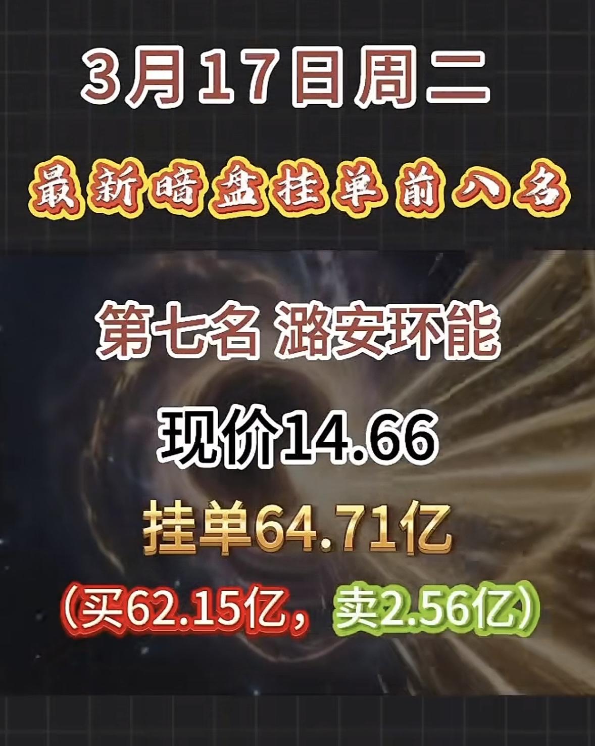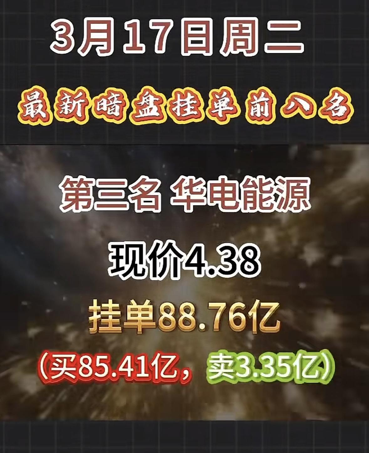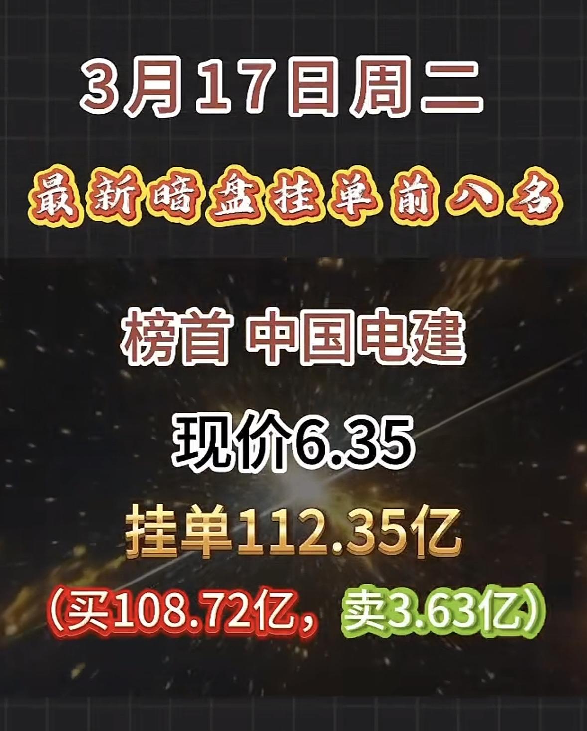 3月17日暗盘隔夜挂单揭晓 中国电建现在股价6.35,挂单有112.35亿,这数字看着就刺激。之前它有过一字跌停的情况,当时报6.47元,成交额127.8亿、换手率14.62%,封单超10万手,资金疯狂出逃。而且股东户数半年暴涨67.94%,明显是散户高位接盘、机构悄悄撤退。 从数据看,它总市值1099.03亿,市盈率TTM 10.26。之前股价从5.14元拉到7.19元,涨幅超40%,获利盘多。这次挂单这么大,后续走势真不好说,是触底反弹还是继续下行,股民们估计都在密切关注。