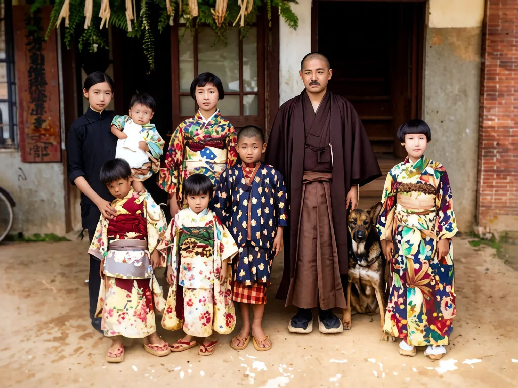 1934年 ,一户台湾人家新年合影,除站在后排角落的女子穿着中式服装外,其他都穿着日本的传统和服。历史