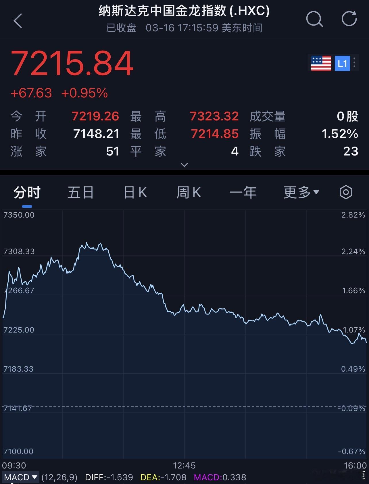 纳斯达克中国金龙指数涨0.95%,热门中概股多数走强,腾讯音乐涨6.34%,富途控股涨5.6%,理想汽车涨5.25%,蔚来涨2.9%。百度跌1.83%。