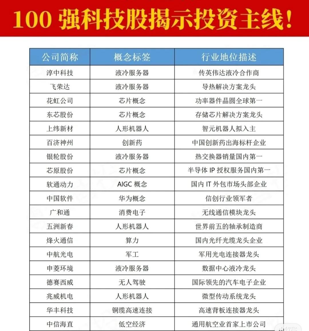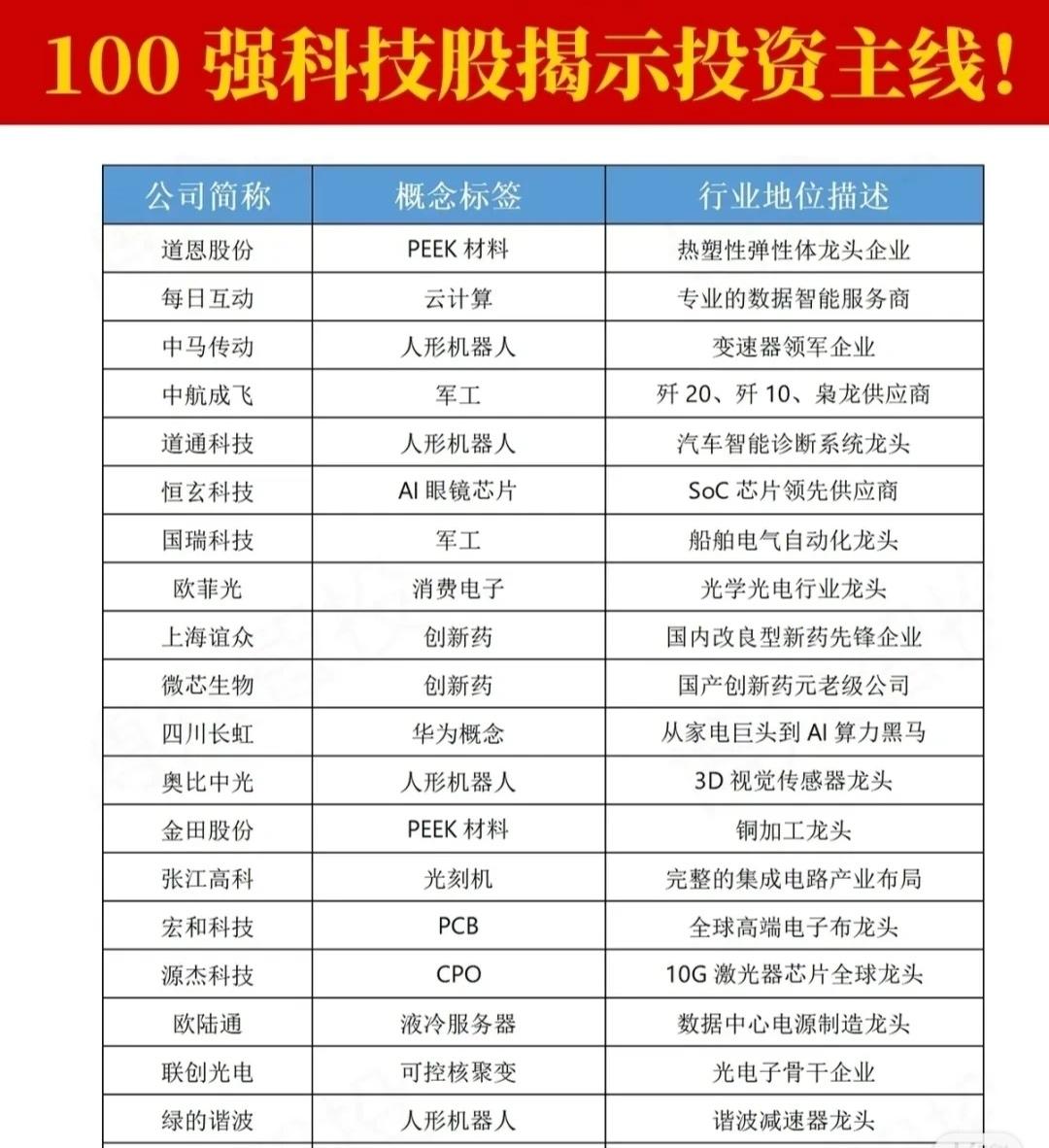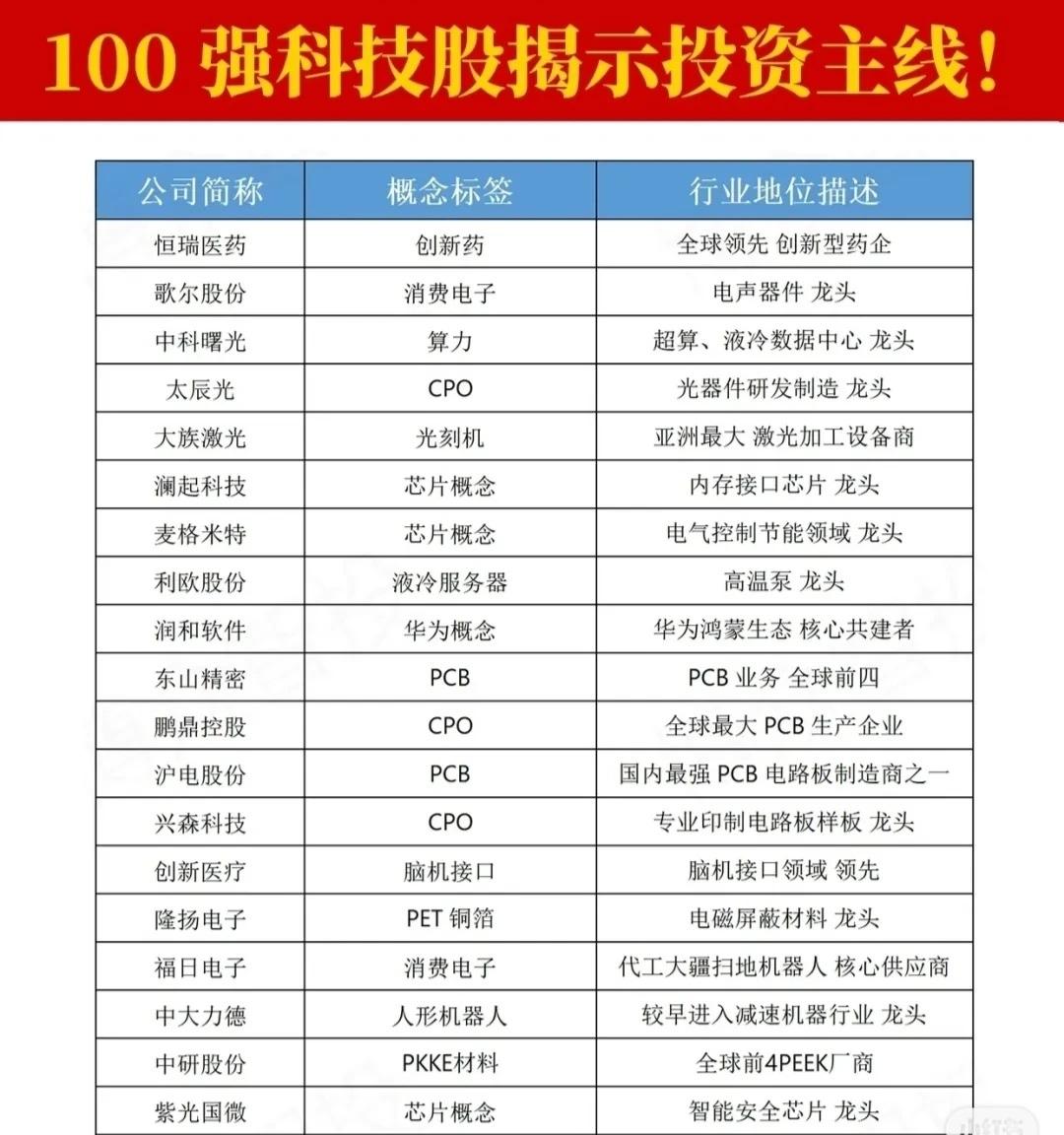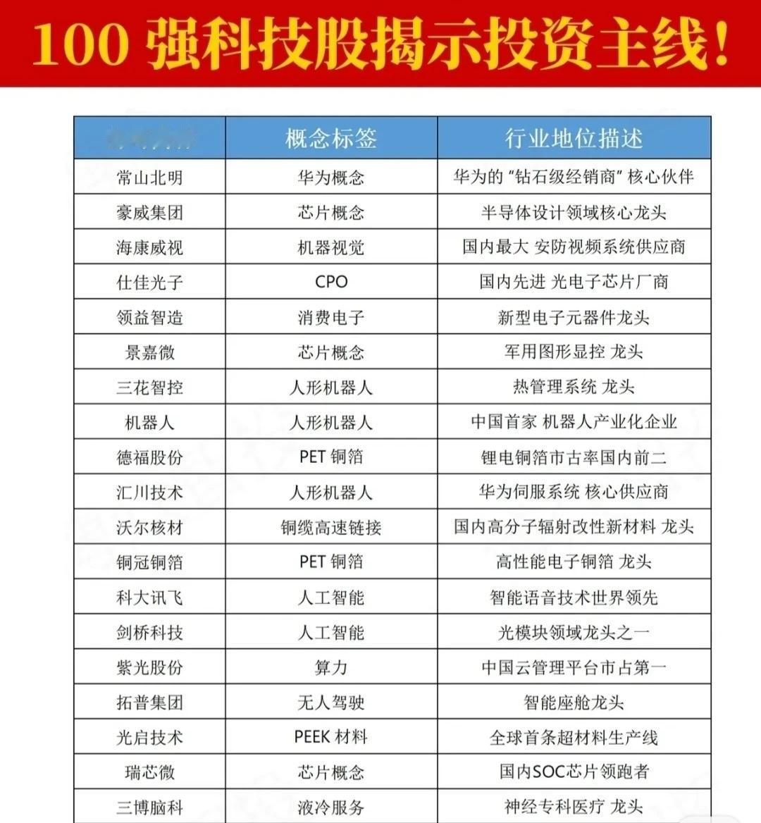 这是一份名为“100强科技股!”的列表,其中列出了多个被市场关注的科技股及其核心标签和行业地位。核心内容可归纳为以下几点: 1. 核心投资主线 * 算力与人工智能(AI):涵盖服务器(浪潮信息、工业富联)、AI芯片(寒武纪、海光信息)、CPU/GPU(海光信息)、数据中心(中科曙光)、AI软件(科大讯飞、同花顺)等,是整个列表中最突出的主线。 * CPO (光电共封装):包括中际旭创、新易盛、天孚通信、太辰光、仕佳光子、源杰科技等,被列为光模块解决方案或光器件龙头,是另一条非常集中的主线。 * 人形机器人:包括卧龙电驱、中大力德、三花智控、汇川技术、五洲新春、绿的谐波、奥比中光、兆威机电、道通科技等,涉及电机、减速器、传感器、控制系统等产业链环节。 2. 重要支撑板块 * 半导体/芯片:覆盖设计(豪威集团、景嘉微、瑞芯微)、制造(中芯国际)、存储(澜起科技、东芯股份)、IP授权(芯原股份)以及功率器件(花虹公司)等,是底层技术和硬件基础。 * 消费电子:包括歌尔股份、立讯精密、中兴通讯、欧菲光、领益智造等,涉及声学、连接器、光学及代工等。 * 新材料与高端制造:如PEEK材料(光启技术、中研股份、金田股份)、PET铜箔(隆扬电子、德福股份、铜冠铜箔)、光刻机(大族激光、张江高科)等。 * 液冷服务器与数据中心散热:英维克、硕贝德、利欧股份、申菱环境、银轮股份、飞荣达、淳中科技、欧陆通等,强调数据中心散热解决方案。 * 华为生态链:润和软件、常山北明、中国软件、四川长虹等,被标注为华为概念或鸿蒙生态核心共建者。 3. 其他细分领域 * 包括创新药(恒瑞医药、百济神州、微芯生物)、军工(中航成飞、中航光电)、无人驾驶(拓普集团、德赛西威)、脑机接口(创新医疗)、低空经济(中信海直)、AIGC概念(软通动力)等。 一句话总结: 这份名单揭示了当前科技股投资的几大核心主线:算力与AI、CPO光电封装、人形机器人,并辅以半导体芯片、消费电子、新材料、液冷散热以及华为生态链等重要支撑板块。