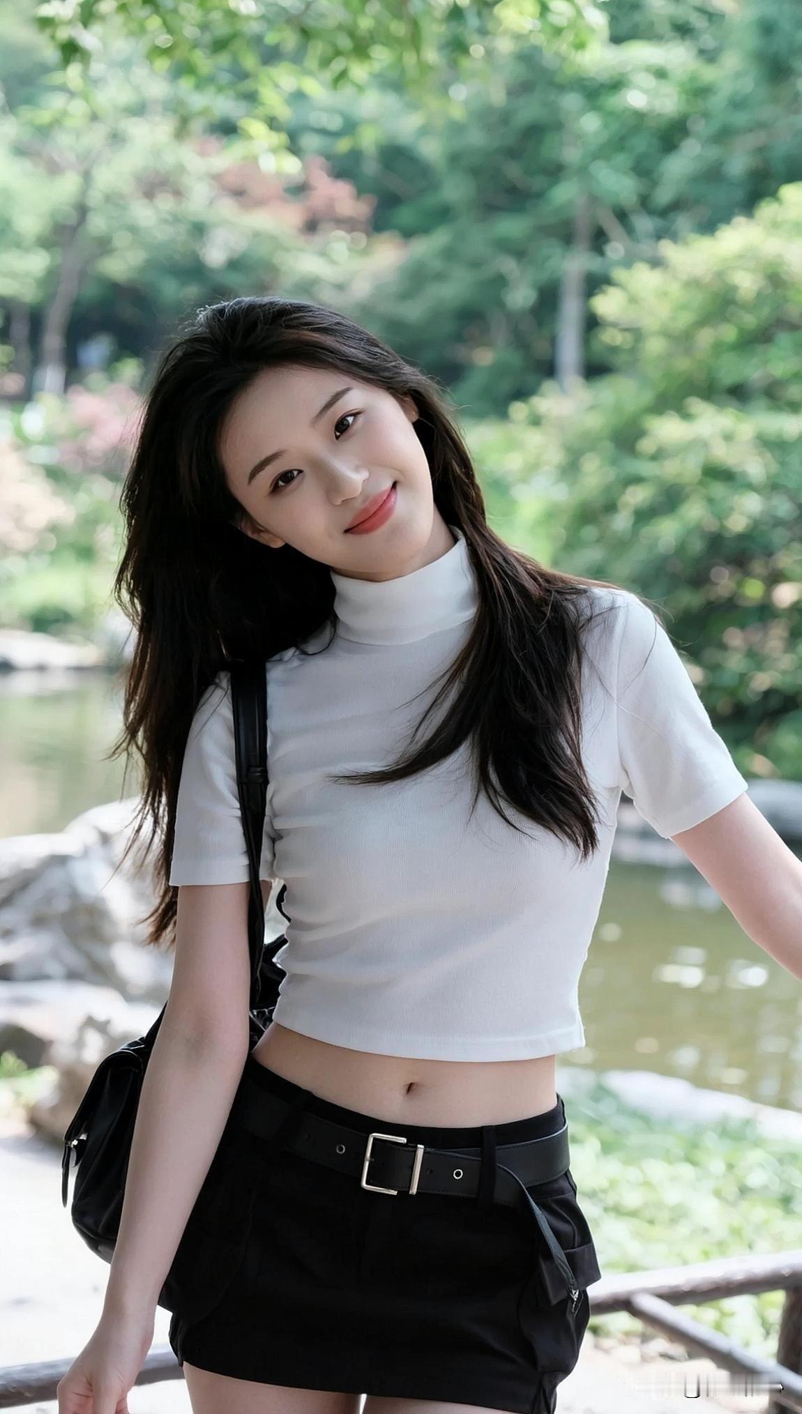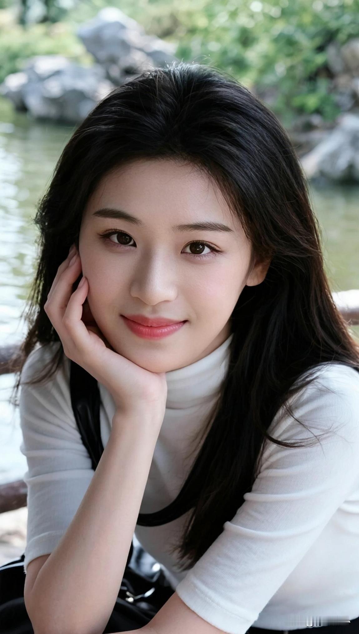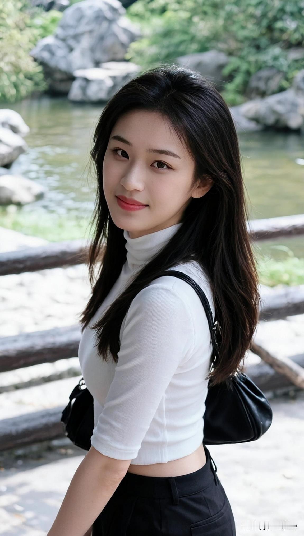 笑里藏春,风骨自带韵味。 在自然的底色里, 不施粉黛,也惊艳了时光。 溪山倩影 溪山叠翠映清涟, 素袂轻扬趁晓烟。 笑靥含春凝媚色, 纤腰约素惹风怜。 云丝漫卷遮星眼, 玉步微移落画笺。 不必浓妆添韵致, 天然风骨自嫣然。 山风把绿浪揉成涟漪 你站在石栏边 白衫裹着阳光的温度 黑裙曳着山野的风 发梢扫过肩线 笑里藏着半盏春茶的温软 不必刻意的风情 是腰肢轻晃时 不经意漏出的灵动 溪声潺潺,树影婆娑 你抬眼的瞬间 便把整座山的清韵 都收进了眉眼间