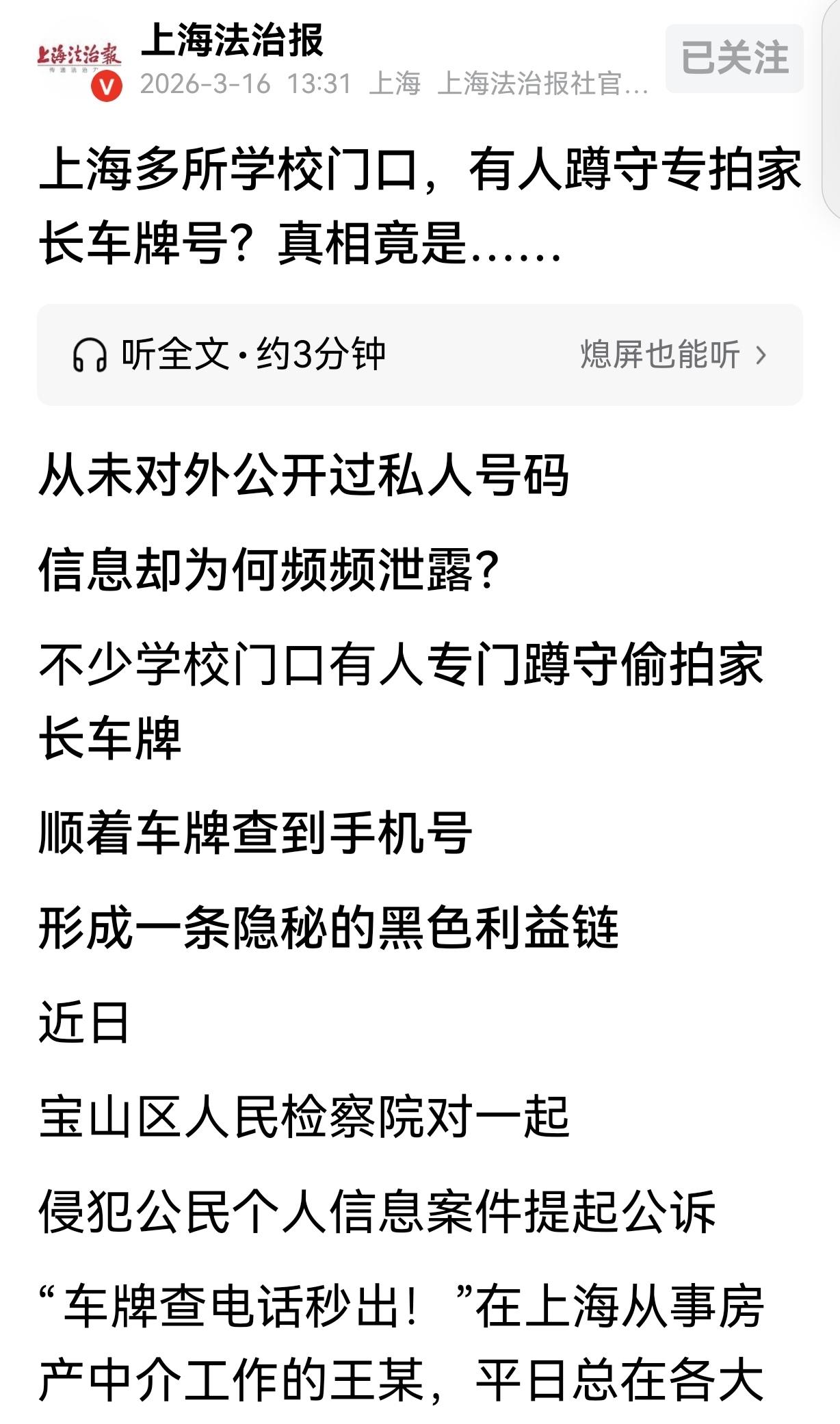 “防不胜防!”上海,一男子是某培训学校法人,他让1个老师蹲守在多所学校门口,专拍家长车牌号,然后再把车牌号发给一个神秘男,神秘男再找上家,通过车牌查到手机号,车主姓名、形成一条隐秘的黑色利益链,神秘男每条收取25元查询费,已经查了2500多条,挣了6.3万多,结果悲剧了。 王某开了一家房产中介,这是他的主业,可他还有一个见不得光的副业,而且生财有道,挣了6.3万多了,这让他经常背后偷着乐。 这天,一培训学校法人徐某又联系王某了,他一看,高兴坏了,又来活了,又有钱挣了。 原来,徐某和王某暗中勾结,徐某让学校老师韩某,没事了就去多所学校门口蹲守,拍家长的车牌号。 然后,徐某就把拍来的车牌号发给王某,王某再去找自己的上家,让他通过查询车牌号,获取车主的姓名,手机号等所有个人信息。 王某作为中间人,他要挣个辛苦钱的,每条信息收取25元,他已经查了2500多条,挣了6.2万,而且,他还会源源不断,挣得更多。 王某做梦都没想到,东窗事发会这么快,他们的勾当竟然露馅了,而且后果很严重。 王某因侵犯公民个人信息罪,被判处有期徒刑3年缓刑3年,挣得钱都得吐出去不说,还被罚款20000元。 虽然缓刑了,但人生履历的污点抹不掉了,以后孩子的前途都受影响,真是追悔莫及呀。 而徐某和韩某,还有王某的上家,一个都跑不掉,全被另案处理,都付出惨痛代价。 在如今信息飞速发展的时代,个人信息安全愈发重要,可这起事件中王某、徐某等人的所作所为,简直是对公民隐私的公然践踏。 他们为了一己私利,构建起这条隐秘的黑色利益链,肆意收集、贩卖家长信息,完全不顾及可能给家长带来的困扰和风险,比如骚扰电话、诈骗陷阱等。 这种行为不仅违背了基本的道德准则,更触犯了法律红线。 他们以为能神不知鬼不觉地赚钱,却没想到最终还是难逃法网。 这也警示着大家,不要心存侥幸去做违法犯罪的事,任何违法行径都会留下痕迹,迟早会受到应有的惩罚。 同时,也应加强对个人信息保护的监管力度,提高违法成本,让那些妄图通过非法手段获取利益的人不敢轻易伸手。 《刑法》第253条规定,违反国家有关规定,向他人出售或者提供公民个人信息,情节严重的,处三年以下有期徒刑或者拘役,并处或者单处罚金;情节特别严重的,处三年以上七年以下有期徒刑,并处罚金。 本案中,王某等人通过非法手段获取并贩卖大量公民个人信息,数量多达2500多条,非法获利6.3万余元,属于情节严重,符合该法条规定情形,所以王某被判处有期徒刑3年缓刑3年并处罚金。 其他涉案人员也受到相应处理,彰显了法律对侵犯公民个人信息行为的严厉打击。 对此。你怎么看?