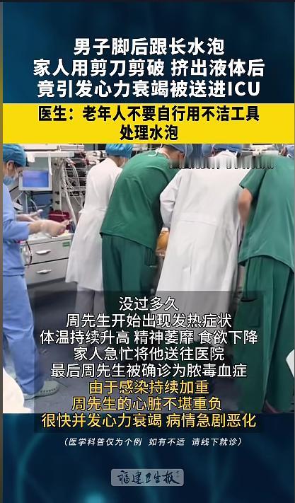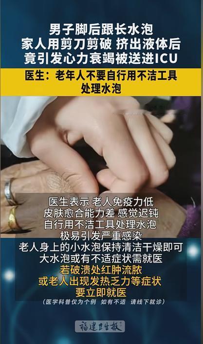 “悲剧还是发生了!”近日,一男子脚后跟起了个水泡,家里人看见后就拿剪刀给挑开了。没想到之后伤口位置出现了红肿溃烂,随后男子开始发烧,并且精神萎靡,家人这才赶紧把他送往了医院。检查结果竟然是脓毒血症!网友:没消毒感染了! 平日里走路太多,或是出汗捂着了,脚上就容易起泡,绝大多数人一看,就找根针,拿打火机一烧,然后一挑,挤出脓水就完事了。不过,挑泡的工具一定得消毒,不然可能会导致二次感染。 据媒体3月9日报道,周先生今年85岁了,不久前,他的脚后跟上起了个水泡,就拿剪刀给挑开了,把里面的脓水挤了出来。 可这之后,周先生并没有好,伤口位置反而还出现了红肿,流脓。随后他开始发起了烧,还伴随着食欲不振,整个人也没有了精神。家人这才把送往了医院。 医生检查后,周先生被确诊为脓毒血症,是由不干净的工具引发的感染。由于送医不及时,感染持续加重,送医后不久病情加重了,还出现了心力衰竭。 网友看后表示,老年人抵抗力下降,受感染的风险增高,出现创面的时候一定要多加注意。平时里出现小擦小破的,不要随便就处理了,一定要做好消毒工作,出现水泡也不要直接挑。尽一切可能降低创面感染的风险! 信息来源:《湖南一男子脚后跟长水泡 ,家人用剪刀剪破,挤出液体后 竟引发心力衰竭 被送进ICU !医生:老年人不要自行用不洁工具 处理水泡 健康