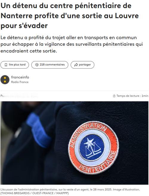邪乎!“法式囚犯游”让法国沦为国际笑柄![灵光一闪][鼾睡] 近日,外网报道了一则关于法国的趣事,让法国人一下子沦为国际笑柄! 消息称: 为帮助囚犯重新融入社会,法国司法部特意安排一批来自法国南泰尔监狱的囚犯,参观巴黎卢浮宫博物馆! 美其名曰是为了践行“法国的公民权教育”! 其目的也极为罗曼蒂克: 带囚犯看一看法国文化、了解一下法国的高超艺术、重温一下法国的悠久历史,通过参观活动希望这批囚犯能得到身心洗礼,可以在未来能更好的融入社会! 结果,有一位囚犯跑了! 有法国媒体报道称,这位逃跑的囚犯因入室盗窃和贩毒罪而被捕入狱,原本 2028年有可能假释,结果因为忍受不住外部花花世界的诱惑,提前跑了! 法媒报道的很有意思: 在RERA线的Auber车站,囚犯甩掉了狱警,消失了!是蒙娜丽莎微笑点头同意的![抠鼻][灵光一闪][害羞][呲牙][耶]