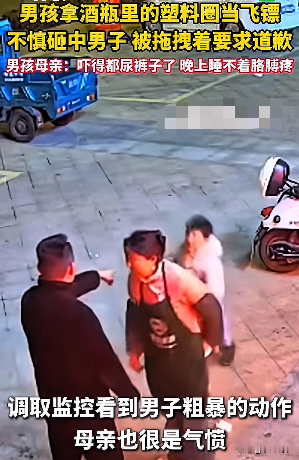 这下惹事了!安徽六安,顽皮男孩拿酒瓶里的塑料圈当飞镖,正巧射中路过男子,男子一气之下拖拽男孩,要求他道歉,男孩嚎啕大哭,然而看完监控,孩子妈妈不干了! 原来据孩子妈妈说,孩子吓得尿裤子,胳膊疼的都不睡着,一看监控,妈妈非常气愤!才知道男子拖拽孩子,这动作太粗暴了,他只是个孩子啊。 首先我觉得,孩子犯了错,必须批评道歉,不能一味的纵容孩子犯错,作为家长如果不教育好孩子,那就只能社会来教育了,社会可不惯着你。 作为男子要求孩子道歉可以,但是也是注意方式方法,可以找家长解决,这么小孩子过于粗暴,武力解决问题更是不可取。 那么对于这件事,大家如何看呢? (信息来源:广州新闻电台)