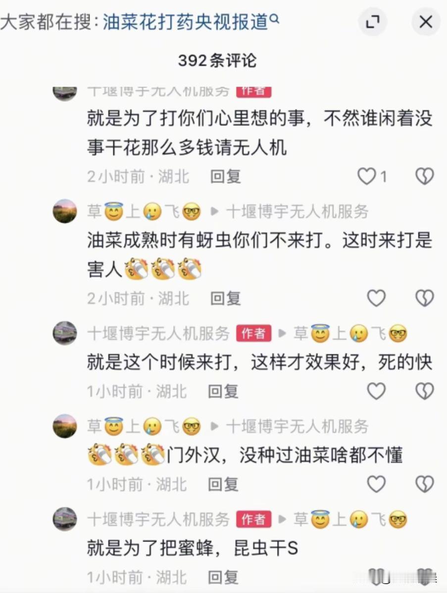 我今天投诉了这个官方号,看这个官媒关于“无人机花期给油菜花打药”的辩解完全在避重