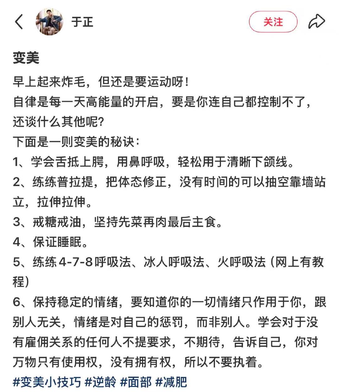 于正分享变美秘诀于正晒照分享变美 3月17日,晒照并配文:“早上起来炸毛,但还是要运动呀!自律是每一天高能量的开启,要是你连自己都控制不了,还谈什么其他呢?”还分享了一则变美秘诀。