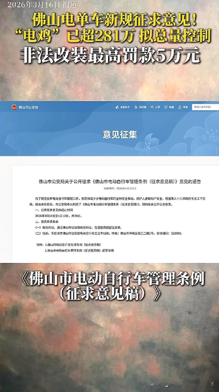 佛山281万电鸡要管了!最高罚5万 外卖小哥和上班族都坐不住了 早上刷到佛山电单车新规征求意见的新闻,瞬间炸了——咱们佛山街头跑的“电鸡”已经超281万辆,现在要控总量,非法改装最高罚5万,连外卖平台都要跟着担责。 作为每天靠电鸡通勤的打工人,太懂这种又喜又怕的心情了。喜的是终于要治那些改装“炸街车”,晚上飙车吵得人睡不着的日子有望结束;怕的是总量一控,会不会买车、上牌更难,以后赶早八要挤破头挤公交? 看了细则才发现,这次是真下狠手:不仅管车,还管人、管平台。改装电机、加电池这些“提速骚操作”,直接罚到肉疼;外卖员为了赶单闯红灯、走机动车道,平台也要被追责。之前在天桥上见过外卖小哥为了抢时间,推着电鸡在坡道上跟行人挤,看着都揪心,现在把责任压到平台头上,总算能倒逼平台给骑手留够配送时间,不用拿命换钱。 有人说“控总量会影响出行”,但换个角度想,281万辆车挤在佛山街头,乱停、闯红灯、交通事故早就成了顽疾。早高峰在季华路上,电鸡跟汽车抢道,下班时小区楼道堆满充电的车,安全隐患谁都看得见。这次新规不是要“禁电”,而是要让“电鸡”跑得更规矩、更安全。 现在意见征集还在进行中,从3月14日到4月12日,咱们佛山人都能去提想法。是支持控总量治乱象,还是担心出行受影响?不妨去说说自己的声音,毕竟这关系到每天穿梭在街头的每一个人。 说到底,佛山的“电鸡”不是麻烦,是无数打工人、外卖员的生计和通勤刚需。管得好,是给城市添便利;管不好,就是给生活添堵。