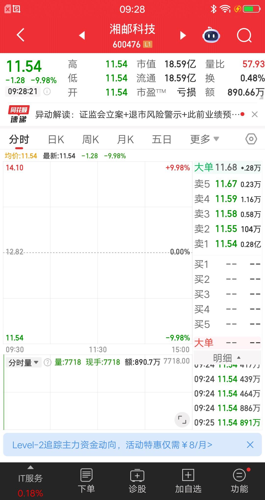 A股今天最惨的票提前诞生了,退市风险警示加上立案调查,两个核弹级别的利空,落在同一只票头上。2.44万股东倒了大霉,吃了一碗大面。 该票集合竞价一字跌停,竞价成交额890多万,本来就是冷门股,再加上重大利空,谁敢去接?即便是里面的主力,也不敢轻易维护股价,搞不好会被埋,所以跌停很正常。 竞价就跑的散户是有纪律的,碰上利空不要有侥幸心理,第一时间挂单跑路才是正解。 公司因涉嫌信息披露违法违规收到中国证监会《立案告知书》,被正式立案调查。 公司预计2025年度期末净资产为负值,触及退市风险警示标准,年报披露后股票简称将加“*ST”。 该票属于IT服务板块,中国邮政第一股,邮政系统核心科技支撑,做邮政数字化+北斗+金融安防+系统集成 。 踩雷的股友,调整好心态,认真总结反思,有些大坑还是能避开的。事已至此,平常心面对。