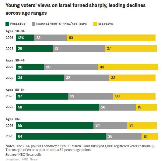调查显示,变化最显著的群体之一是年轻登记选民。2023年时,35岁以下选民中有26%对以色列持正面看法,37%持负面看法,已经表现出一定怀疑态度。