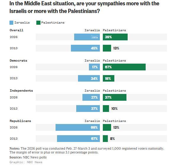 NBC新闻民调显示,2023年至2026年间,共和党人对以色列的正面评价从63%下降到54%,略有下滑。但仍有三分之二的共和党人表示更同情以色列人,这一比例与加沙战争开始时基本一致。
