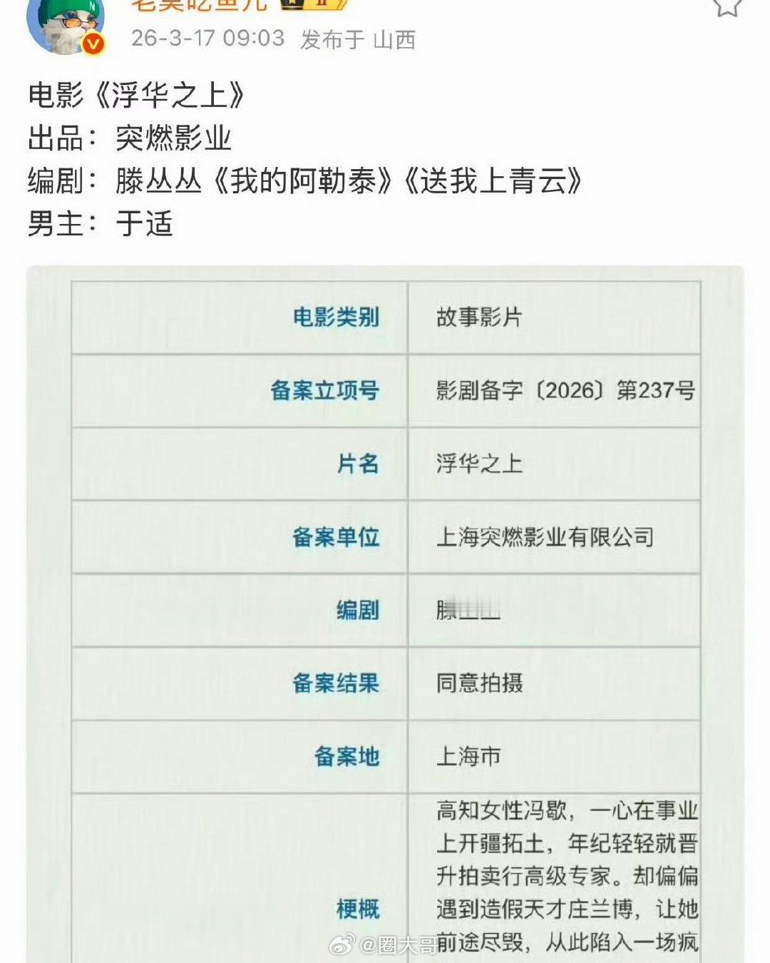 网传赵丽颖于适合作电影浮华之上赵丽颖拒绝了正午阳光的《开盘》后,居然是为了接新电影啊,电影《浮华之上》备案,男女主定了赵丽颖和于适,编剧是滕丛丛。这也是于适和赵丽颖的首次合作,侯燥开机吧!赵丽颖于适或将主演浮华之上