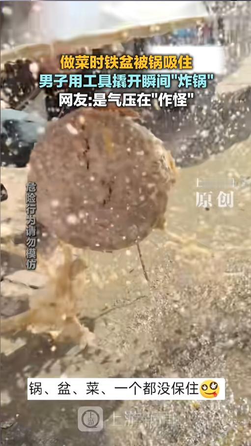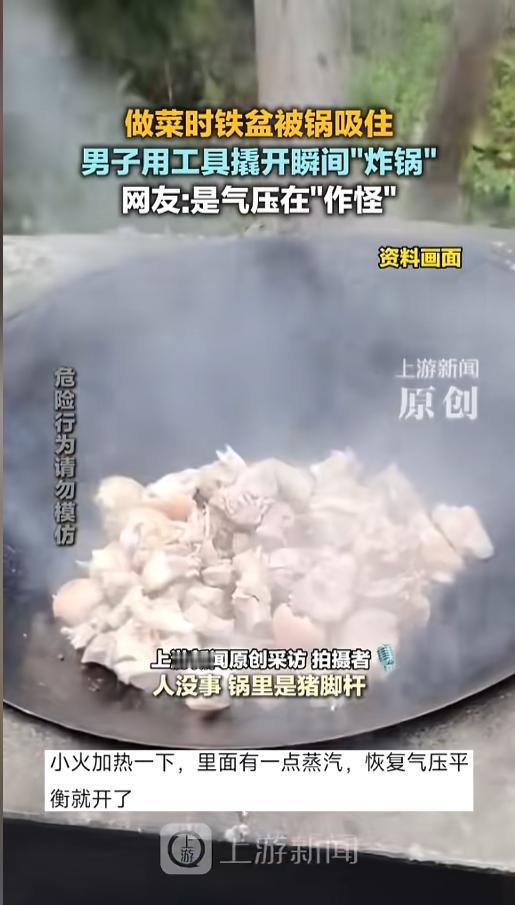 “一看就没好好学习!”近日,四川,一男子用炒锅炖猪脚杆时,没找到合适的盖子,就找了铁盆扣了进去。结果菜熟了以后,盆抠不下来了!情急之下,男子找出螺丝刀硬撬,撬开的瞬间炸锅了,盆也飞了,锅也飞了,菜也飞了。网友:其实加热一下就行! 俗话说,学好数理化,走遍天下都不怕,不学数理化,生活处处是魔法。无数的生活小妙招背后,都有着理化知识的影子,极大地方便了我们的生活。 据媒体3月10日报道,事发当日,男子炖了一锅猪脚杆,做菜时找了个铁盆,当锅盖扣了上去,别说,还挺严丝合缝的。菜熟了之后,男子也没有把铁盆拿下来,扣在锅上一起端了下来。 没想到,过了一会,锅凉了。男子准备盛菜时却发现,铁盆儿拿不下来了。他又是抠又是别的,怎么也取不下来。 随后,他找来了锤子和螺丝刀,把锅放在了平地上。他先是用螺丝刀对准盆和锅连接处的缝,然后一锤子砸在螺丝刀柄上。 敲击的瞬间,就炸锅了。盆飞出去老高,锅崩出去老远,里面的菜也撒了一地。好在男子躲闪的快,才没有被崩到,只是除了人没受伤,其他的都坏了。 网友看后表示,这其实就是气压在作怪。锅冷了之后,里面的气压降低,盆和锅之间又不漏气,就把盆死死地吸住了。其实只要把锅重新放回灶上热一下,里面有蒸汽了,盆很轻松的就能拿下来了。 信息来源:《3月10日(采访),四川,