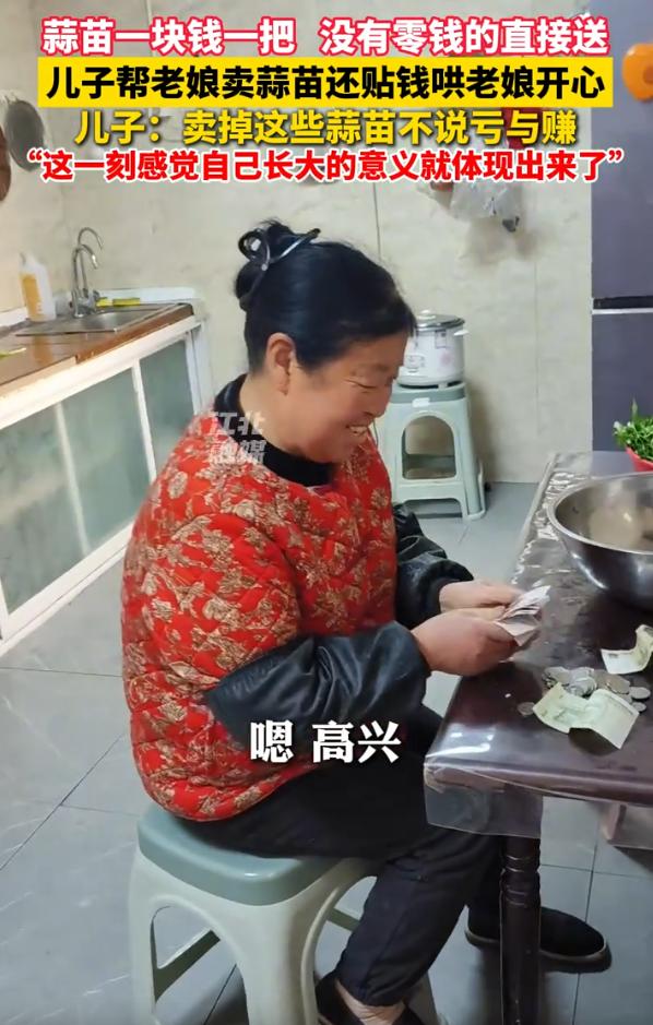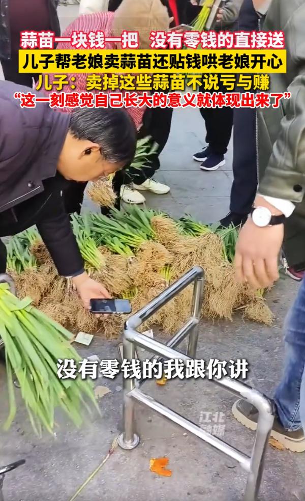 安徽蚌埠,一位老人种了蒜苗却卖不出去,儿子看老娘发愁,就直接拉着蒜苗到城里去卖,一块钱一把,没有零钱的免费送,最后自己还倒贴了200多块钱,可看到母亲开心的样子,他瞬间觉得一切都值得,而自己长大的意义就在于此 崔先生前几天回老家,一进门就看见老娘坐在院子里发呆。问他咋了,老娘指着地里那片绿油油的蒜苗说,种了一亩多,长得挺好,可就是没人来收 老太太今年65了,身子骨不算硬朗,但一辈子闲不住。去年冬天琢磨着种点啥,最后拾掇了一亩多地,种上了蒜苗。浇水施肥,伺候得跟孩子似的。眼瞅着开春蒜苗长得水灵,结果村里收菜的贩子今年不来了 崔先生听完,二话没说,把后备箱清空,割了一车蒜苗就往市里跑 到了市里,他也不找菜市场,就在路边找了个地方,把蒜苗往地上一铺,扯着嗓子喊:这是我老娘种的,种多了卖不掉,在家发愁呢。一块钱一把,自己拿,没零钱的就直接拿走,不用给了 这一嗓子喊出去,还真管用。路过的人一听这大实诚话,纷纷停下来。有拿一块钱扫二维码的,有掏出现金扔下的,也有确实没零钱、道声谢就拿走的。崔先生就在旁边看着,也不记账,也不点数,谁拿都行 有人问他,你这样不得赔啊? 崔先生笑笑说,赔就赔呗,老太太高兴就行 果然,那一车蒜苗很快就见底了。一共卖了107,崔先生又倒贴200块钱,给母亲交差了307块,母亲一看笑得合不拢嘴 这事传到网上后,很多人点赞。但也有人说,这是典型的善意的谎言,崔先生是个有心人 其实想想,农村老人最怕啥?不是没钱花,而是觉得自己没用了。种点东西卖不掉,嘴上不说,心里难受。那种挫败感,比亏点钱还让人堵得慌。崔先生懂这个,所以宁可自己贴钱,也要让老娘觉得自己还能干、还能挣 这事儿让我想起一句话:孝顺不是给多少钱,而是懂老人的心