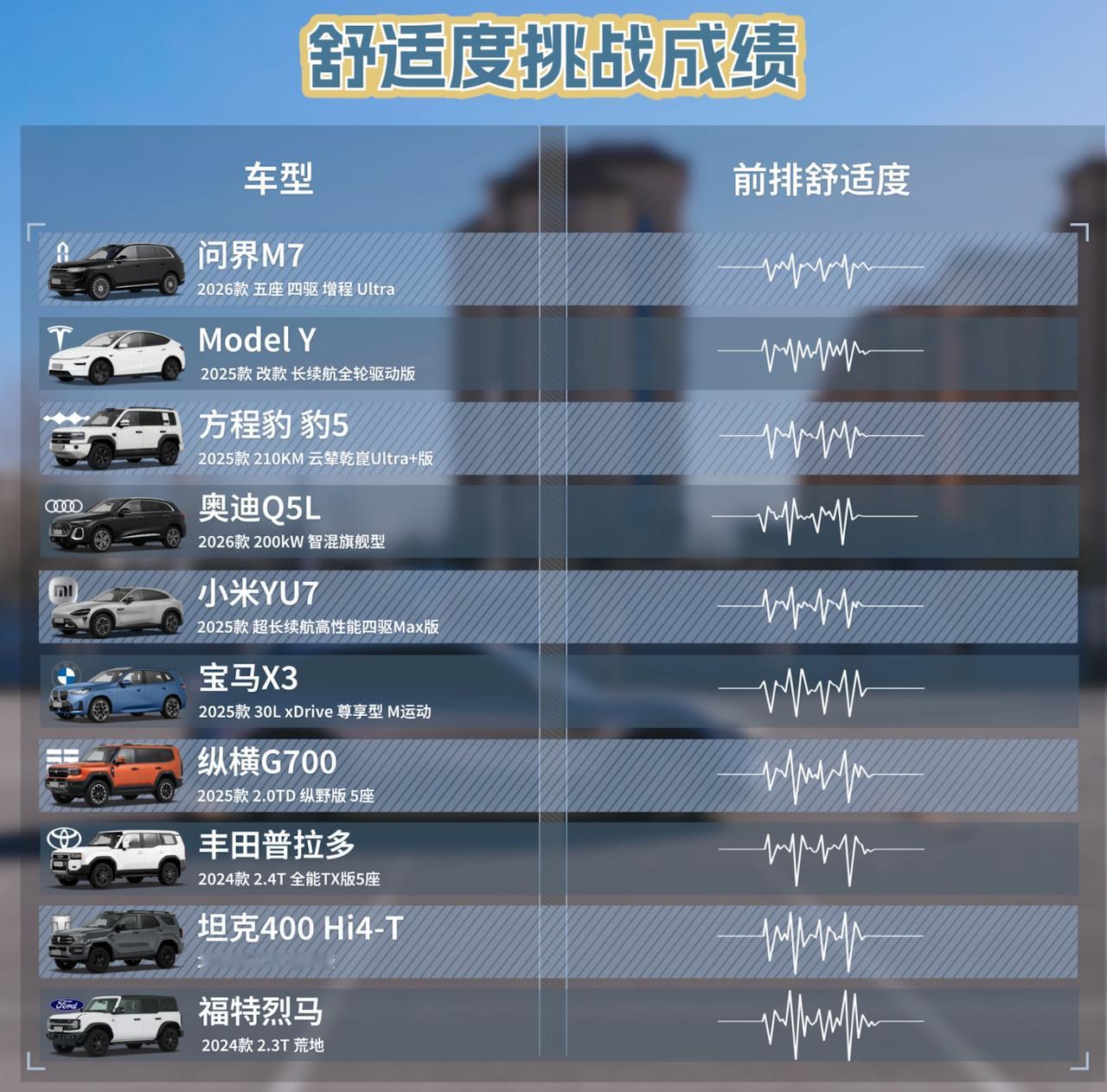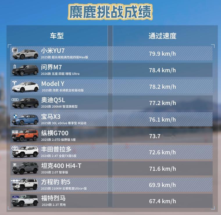 麋鹿中,城市SUV稳定在76–80km/h,小米YU7近80km/h;硬派越野67–74km/h,虽略低,但早已不是之前笨重的形象。舒适度上问界M7断层领先,方程豹豹5靠云辇P解决弹跳难题,越野也能很舒服。油耗差距最现实,宝马X3低至6.32L/100km,硬派越野普遍10L以上,日常用车成本差一大截。