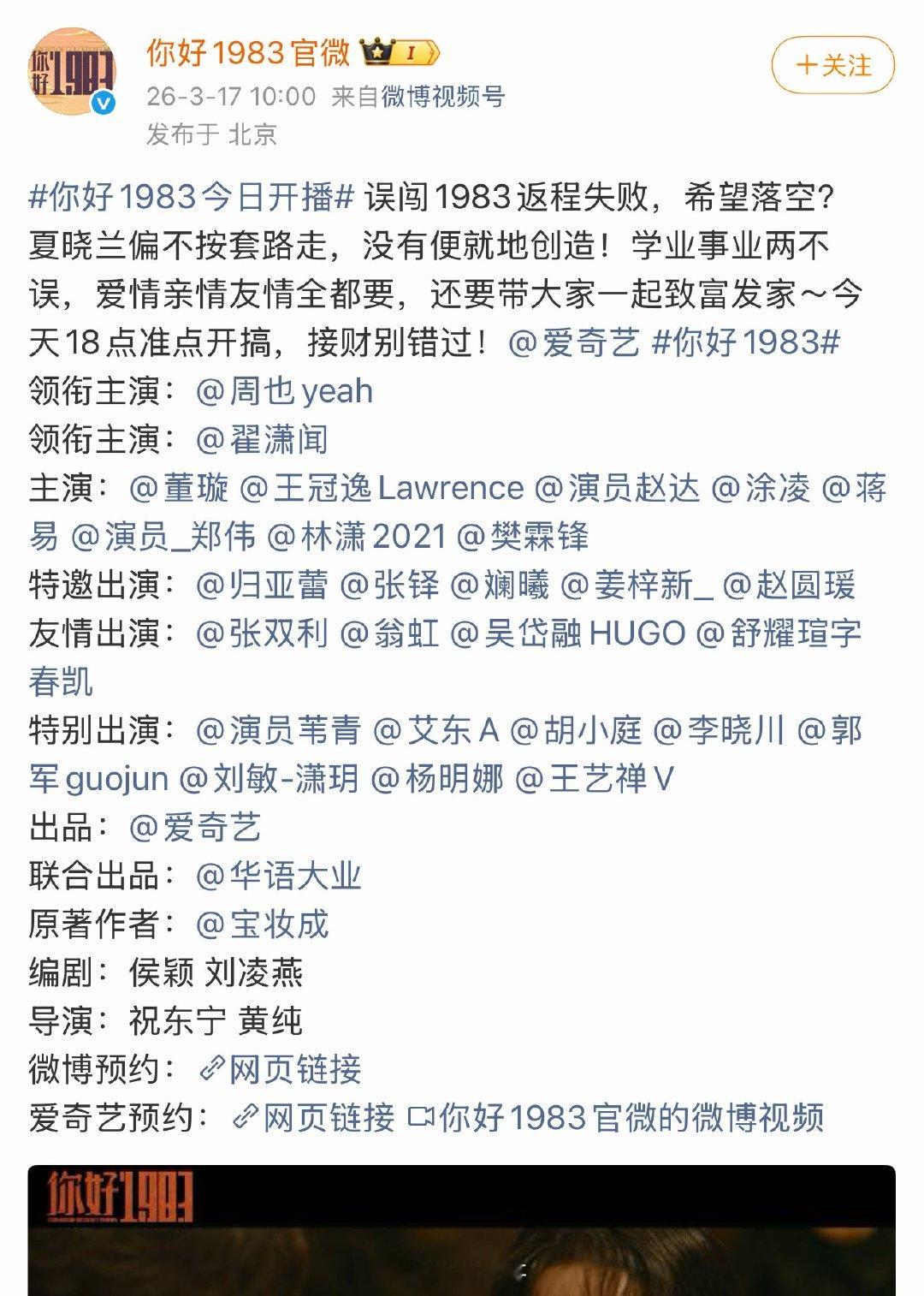 周也翟潇闻你好1983终极预告哇哇哇哇,周也、翟潇闻主演的电视剧《你好1983》终极预告来了,就是说这部剧的题材还挺有趣的,周也和翟潇闻在剧中的港风造型让人眼前一亮,女神董璇也有出演,坐等新剧开播啦~你好1983终极预告