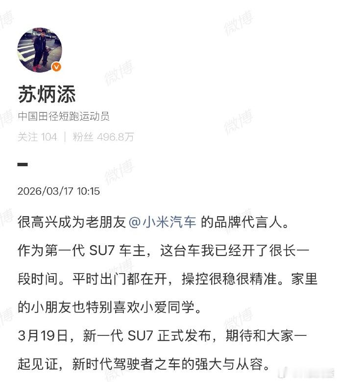 其实苏炳添不是小米的新朋友了,之前就是代言人,自己也是第一代SU7的车主,开了很