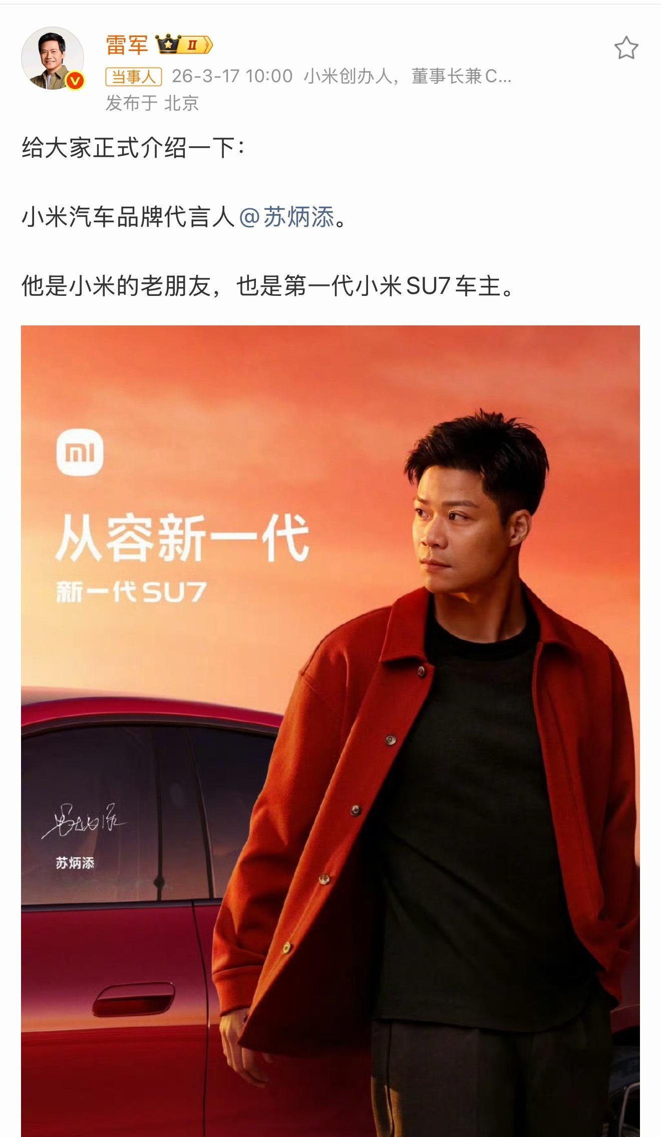 苏炳添说小米SU7已经开了很长时间苏炳添才是小米找代言人的神操作!他不仅是“SU”开头的名字跟SU7互为梗,更是真正开了第一代SU7 Max一年多的常驾用户。2024年11月提车、三月官宣代言,这段时间他每天开着车训炼、接娃、出差,甚至夸“操控稳、精准”,孩子还迷上小爱同学,这种真感受比任何宣传片都真实。