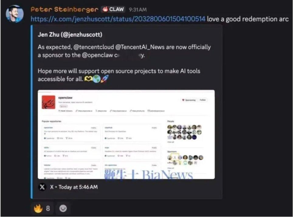 3月12日龙虾创始人PeterSteinberger抱怨腾讯抄袭。3月15日龙虾创始人PeterSteinberger感谢腾讯成为OpenClaw赞助商