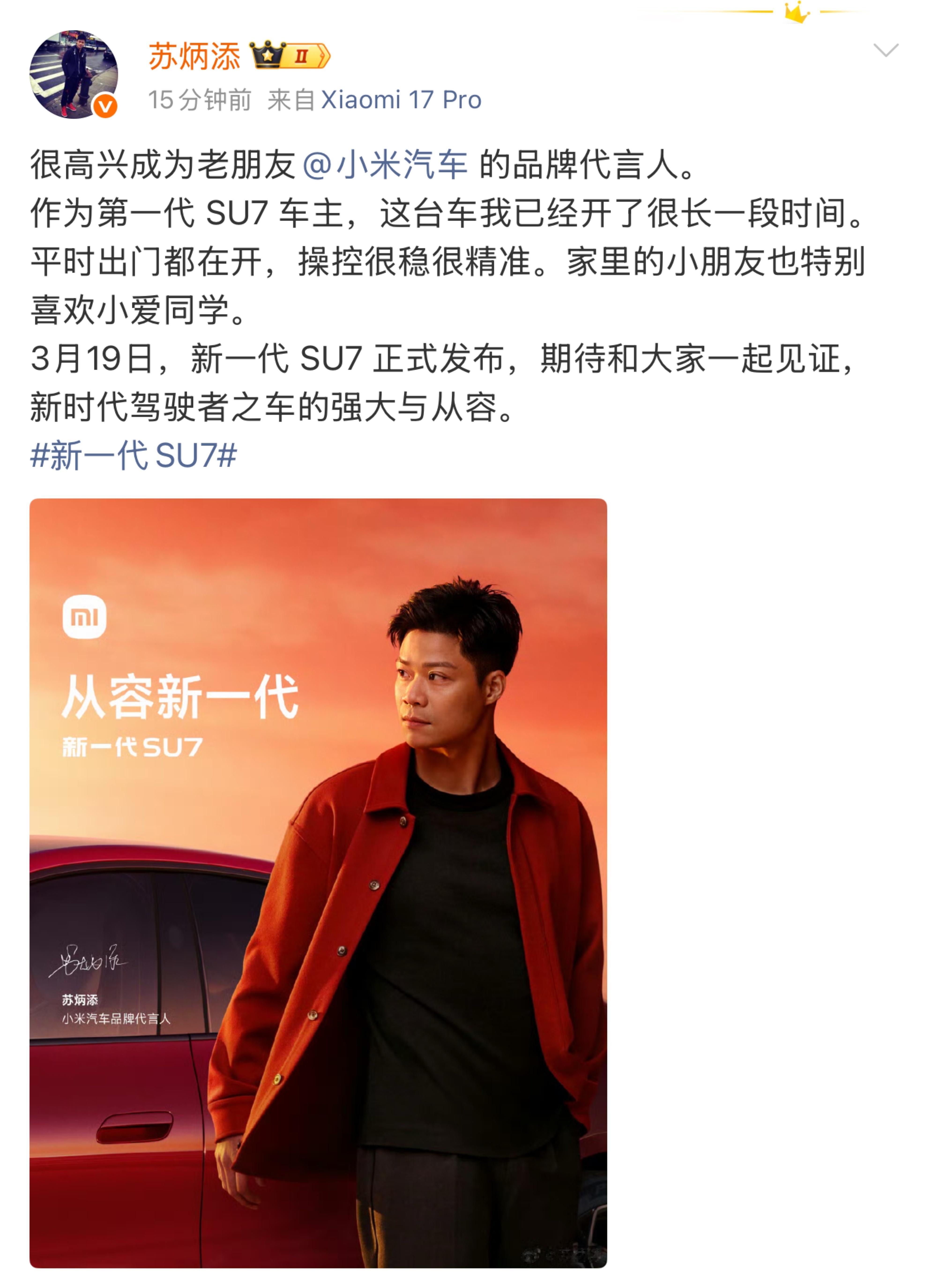 苏炳添官宣代言小米汽车 雷军总官宣了,百米飞人苏炳添成为小米汽车品牌代言人!都姓“SU”,而且阿苏是实实在在的小米车主,真开,真体验,真认可,更有发言权,这俩放一起感觉确实很搭。想当年苏炳添那9秒83,一战封神,是唯一站在百米决赛舞台上的亚洲人,还和博尔特同台竞技过,硬生生重新定义了中国速度,令人敬佩。而后来居上的小米SU7也是一样,实力圈粉,还直接干到纽北和国外顶级跑车PK,又被全球车企拆着研究,靠的不是营销,是真本事,更是中国高端制造的自信。相信新一代小米SU7会再续小米汽车神话,或许带来更大惊喜!