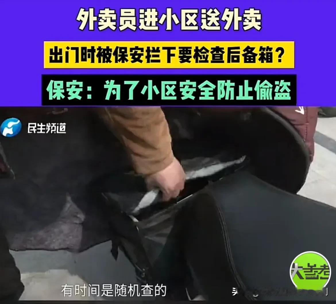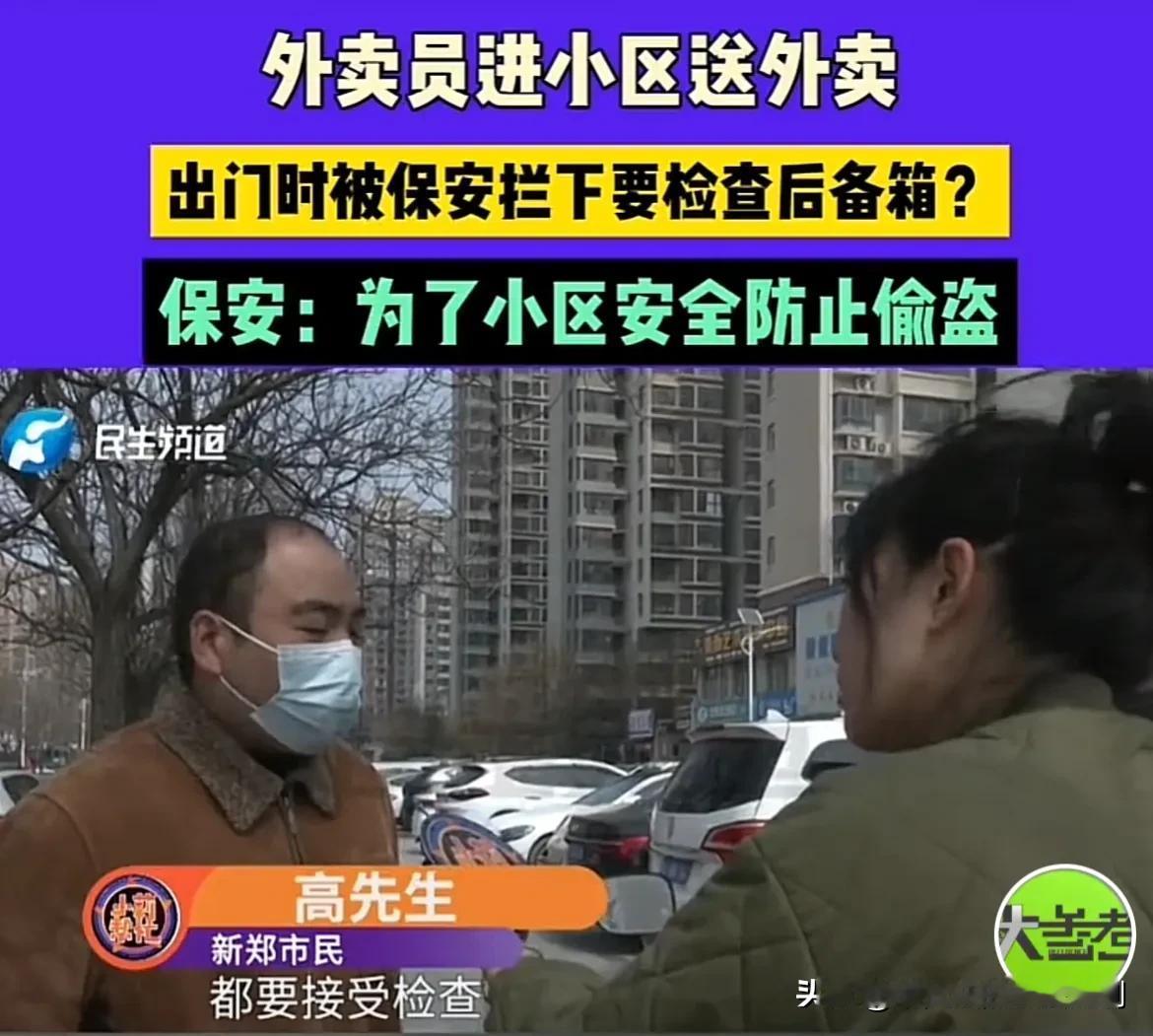 河南新郑,一男子给小区送完外卖,出门时却被保安拦住了,要求查看男子的后备箱。男子不同意,保安就拦着男子不让走。双方僵持了60多分钟,男子实在耗不起了,只能打电话报警。民警询问保安为何扣车,保安的解释,让男子委屈的直想哭。 高先生是一名外卖员,干这一行别看月收入挺高,可里面的辛酸,只有亲身经历的人才最清楚。 为了能多挣一些钱,每天天不亮,高先生就要起床,一直忙活到凌晨才舍得回家。 如果说仅仅是辛苦一点,高先生能完全接受。唯一让他接受不了的,是来自他人异样的眼神。 事情的大致是这样的,高先生接到了一个外卖派单,收货地址是某小区内。 高先生取完餐之后,以最快的速度将外卖送到了顾客的手中。可是进门的时候好好的,等他准备出去的时候却出不去了。 保安直接拦住了高先生,要求查看高先生的后备箱,坐桶箱以及外卖箱。 高先生听完就懵了,自己又没有做什么事情,怎么就无缘无故的要搜箱子呢? 话又说回来了,这些箱子里放的东西都是他个人物品,保安有什么权利能搜箱子呢? 见高先生不愿意,保安也不再废话,直接把高先生的车给扣了,什么时候搜查完?什么时候让高先生离开。 高先生送外卖这么多年,高中低档小区他都去过,什么样的保安他都接触过,不给搜箱子就不让出去的保安他还是第1次见。 高先生据理力争,可对方就是那个态度。 送外卖这份工作本来就是与时间赛跑,一整天的时间里也就饭点单子还多一些。要是过了这个时间段,基本上没有什么单子了。 没有单子就挣不了钱,高先生却被扣在小区门口出不去。 眼看时间就这么一分一秒的过去了,高先生被急得满头大汗,而保安却悠闲的坐在保安室里,一脸幸灾高先生。 实在耗不起了,高先生只能打电话报警求助。 民警赶到现场后,先是询问保安为什么要扣留高先生的电动车,保安的解释让高先生委屈的直想哭。 原来,这个小区的业主经常会向物业反馈,小区里存在丢东西的情况。一次两次还好,如果次数多了,物业公司肯定要有所行动。 于是,物业公司便下达通知,要求但凡从小区出来的车辆,必须要进行检查,保安必须要执行到位。 高先生这次算是明白了,原来保安是怀疑他偷了小区里面的东西。 民警也考虑到保安是职责所在,对保安进行批评教育之后,接着对高先生的后备箱进行了检查,在里面并没有发现任何违规的东西,高先生也得以理离开小区。 事情看似已经解决,可高先生心里实在咽不下这口气,虽然他干的行业没有什么技术含量,甚至说是最辛苦的那一种。可是每挣了一分钱,都是高先生用汗水换来的。 保安却如此怀疑他的职业素养,这也让高先生很受伤,于是便找来记者诉诉苦。 记者问高先生,是不是保安紧把他的车给拦住了进行检查? 高先生说,在他被扣车期间,好像并没有其他车辆经过门口。至于对不对其他的车辆进行检查,他也不清楚。 有人说,保安做的确实有些过分,如果小区真的有这样的规定,可以在高先生进小区之前就对高先生进行告知。而不是等高先生出来的时候,才要求对高先生的车辆进行检查。 最主要的是,保安也没有这方面的权利。 不过也有人认为,这件事错不在保安,工作任务是领导安排,保安只是严格执行而已。保安这份工作也不容易,如果他不照例对高先生检查的话,说不准他就会被领导批评,甚至可能会被辞退。 至于高先生认为被针对,更是没有证据能够直接证明他的这个说法。 《保安服务管理条例》第三十条规定,保安员不得搜查他人身体,不得限制人身自由、侮辱殴打、扣押没收证件财物。 保安没有搜查的权利,更没有限制他人人身自由的权利,之所以会这么做,完完全全是因为领导给的工作任务。 如果保安不这么做,他就要受到批评,受到处罚,至于违不违法,他们并不关心。 这事归根结底,主要问题还是出在物业上。小区里丢了东西,为什么不加强巡逻?为什么不报警处理? 对此你怎么认为?