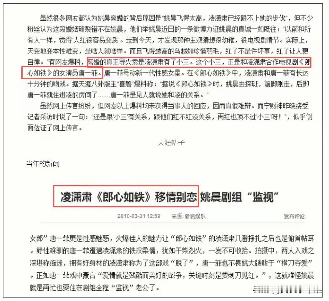 真的很不喜欢唐一菲嘚吧她跟凌潇肃之前的那点破事,因为她并不无辜!当年姚晨事业飞升,凌潇肃选择躺平,甚至以“姚晨丈夫”自居,面对妻子的不满,选择出轨来赌气,实在是有点幼稚。 唐一菲跟凌潇肃09年拍摄《郎心似铁》的时候,跟凌潇肃的绯闻满天飞。唐一菲让凌潇肃在现场给她喂水果,更是跟凌潇肃同吃一碗面,还在平台上与凌潇肃各种互动频繁,称呼凌潇肃为“疼人的欧巴”,当姚晨不存在一样。 你要说这只是剧组的炒作,事情不是真的。那么你俩是怎么在凌潇肃离婚后神奇地很快再婚的?不是应该更加懂得避嫌而不相见面吗?更何况前面你也赌咒发誓说你们只是兄妹这辈子不可能再在一起,怎么你家发誓不怕雷还是罔顾人伦? 凌潇肃不都在微博里承认你俩当时就在一起了,你这现在倒是委屈上了。 刘烨是说过姚晨跟曹郁当初在剧场认识后眼神不对劲了,但是也没说明人家就在一起了啊,即便是后来就在一起了,那也是2010年在你们之后了,只能说明你们都不清白,但姚晨至少知道闭嘴,拿作品说话,不像你们逮着之前自己并不占理的丑闻还在那里炒作。姚晨 姚晨曹郁官宣离婚
