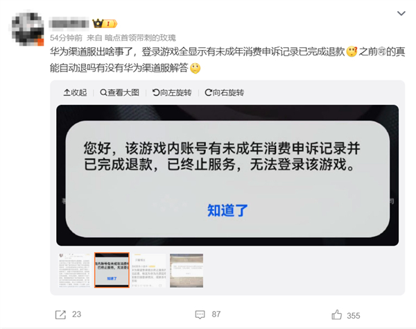 用户普遍反馈从未发起过退款申诉,且账号实名认证为成年人。部分玩家使用非华为手机(如小米)通过华为应用市场下载渠道服客户端,同样触发封禁。