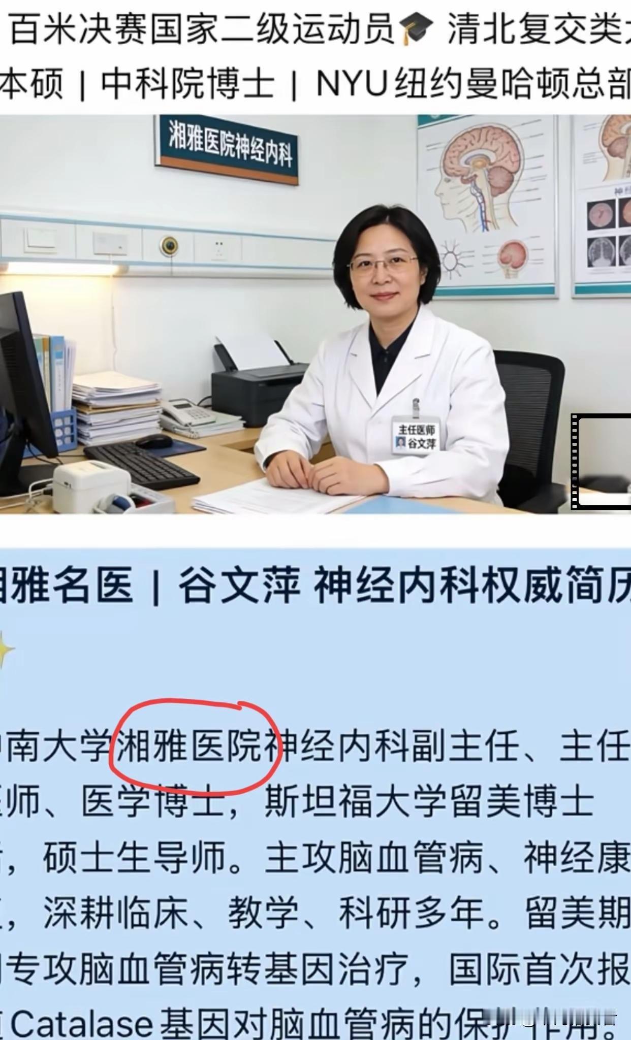 湘雅医院研究生孙同学的导师谷文萍,本硕毕业于湖南医科大学,曾赴美斯坦福大学深造,