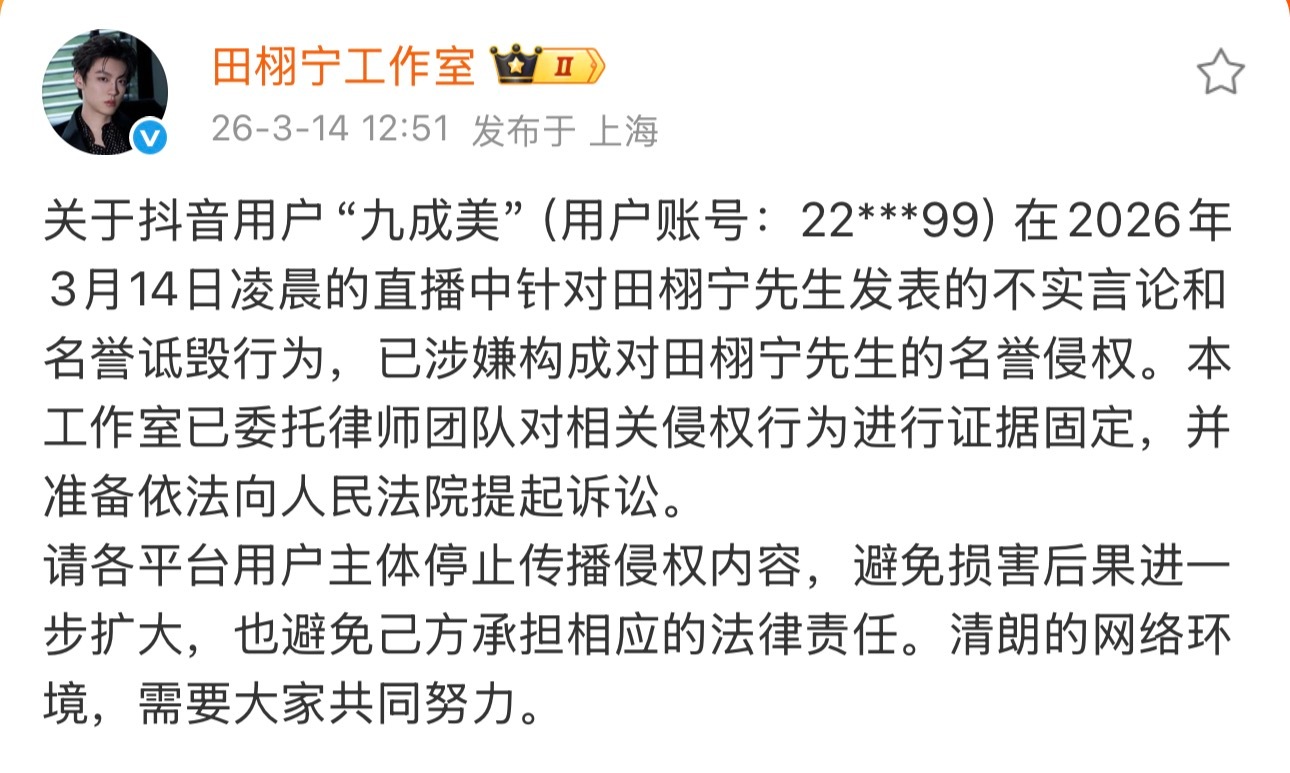 上一个造谣已经道歉了一切交给法律田栩宁隐婚生子被指缺乏司法级证据