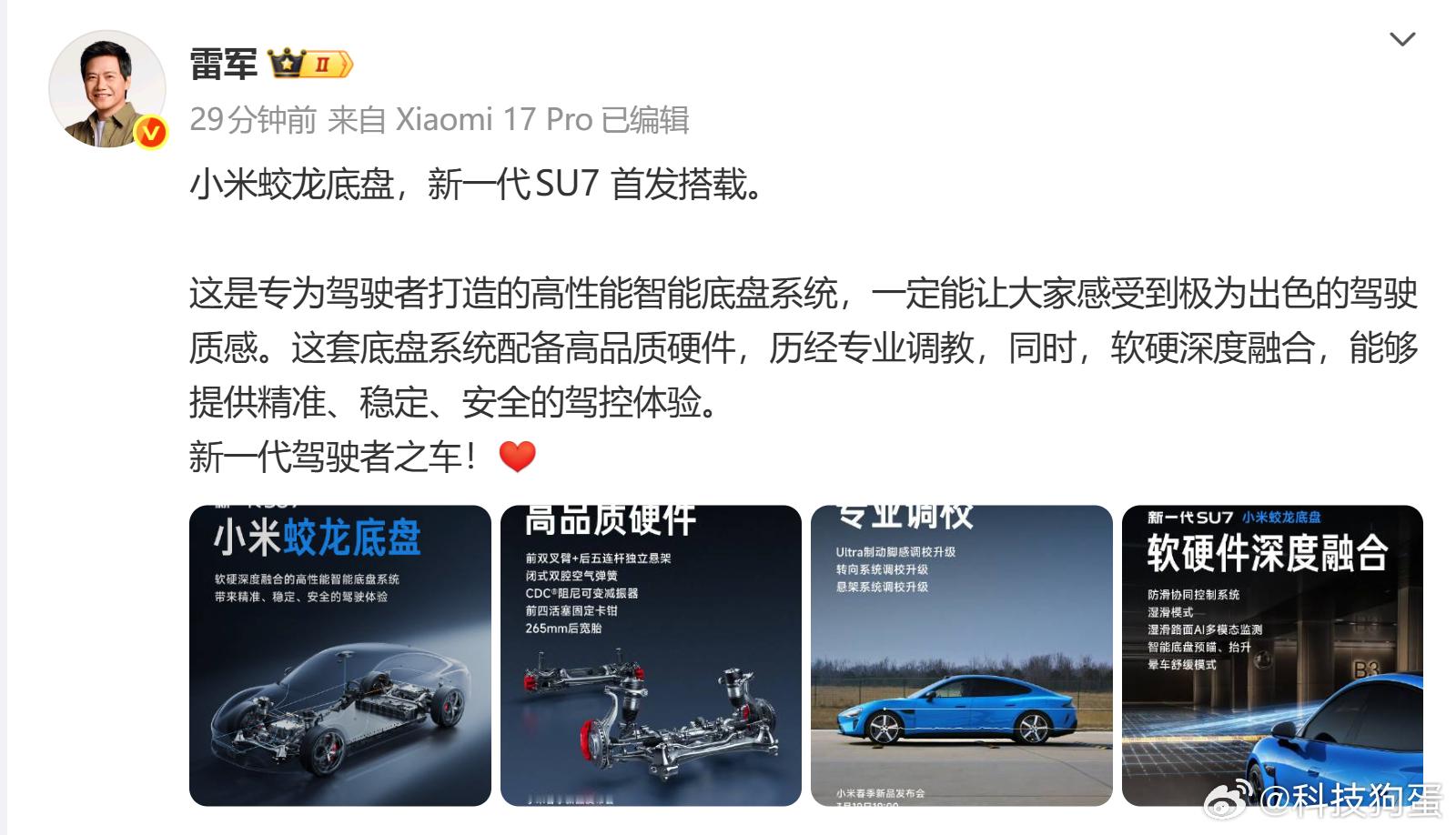 当然,硬件参数是一回事,连续弯道里悬架跟不跟脚、滤震够不够细腻,还得等摸到实车再说。等门店开放试驾了,狗蛋必须亲自去试试这套底盘的功底小米新SU7全系首发搭载蛟龙底盘