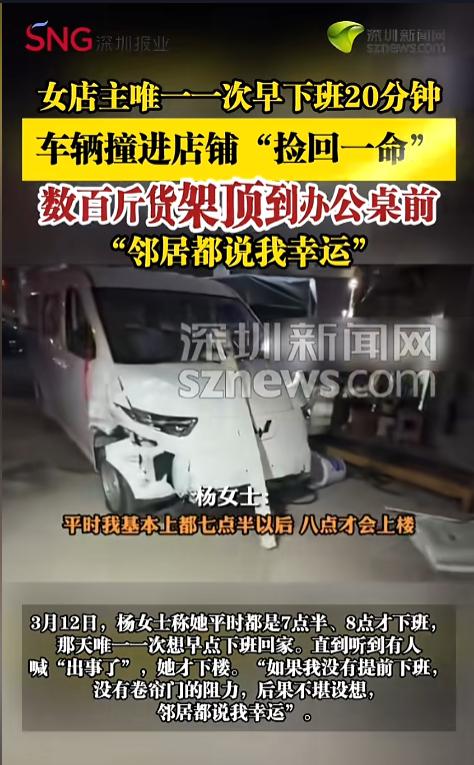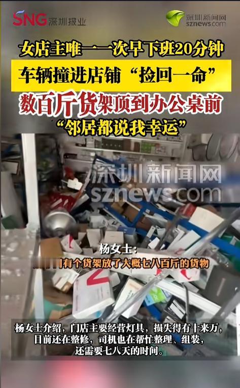 “福大命大!”近日,安徽合肥,一女店主心血来潮,想早下班一次,就比以前提前关门上楼了。20多分钟后,她听到有人喊“出事了”,下楼一看,自家店铺竟被一辆车给撞了,现场十分狼藉,常待的办公桌也被顶到了角落!网友:女人的第六感! 生活之中有太多巧合,有些事巧得离谱,仿佛冥冥之中自有天助一样。 据媒体3月12日报道,杨女士经营了一家灯具店,平时自己都是七点半以后甚至快8点才下班。事发当日,杨女士想早下班一回,就关了店上楼去了。 没想到二十几分钟后,她听到有人大喊“出事了”,赶紧下楼查看,眼前的一幕不禁让她感到一阵阵后怕。 一辆车撞进了自己的店铺,卷帘门被撞了个稀巴烂,里面的东西碎了一地,自己经常待的办公桌也被顶到角落,现场一片狼藉。就这,还是有卷帘门挡着给缓冲了。 杨女士说,店中间有个架子装了七八百斤的货,已经被撞烂了,要是当时门没关,要是自己当时还在店里,怕是命都没了。邻居都说杨女士非常的幸运。 事后,杨女士对店里进行了盘点,损失大概得十几万,现在正在重新装修呢。那个司机也来帮忙了,没有七八天的时间,也整修不好。 网友看后表示,大难不死必有后福,经此一难,相信杨女士的生意会更上一层楼!从另一个角度来说,这是不是老天爷在提醒杨女士,平时不要太卷,早下班一会儿呢? 信息来源:《【女店主唯一一次早下班20分钟,车辆撞进店铺“捡回一命”】》深圳新闻网