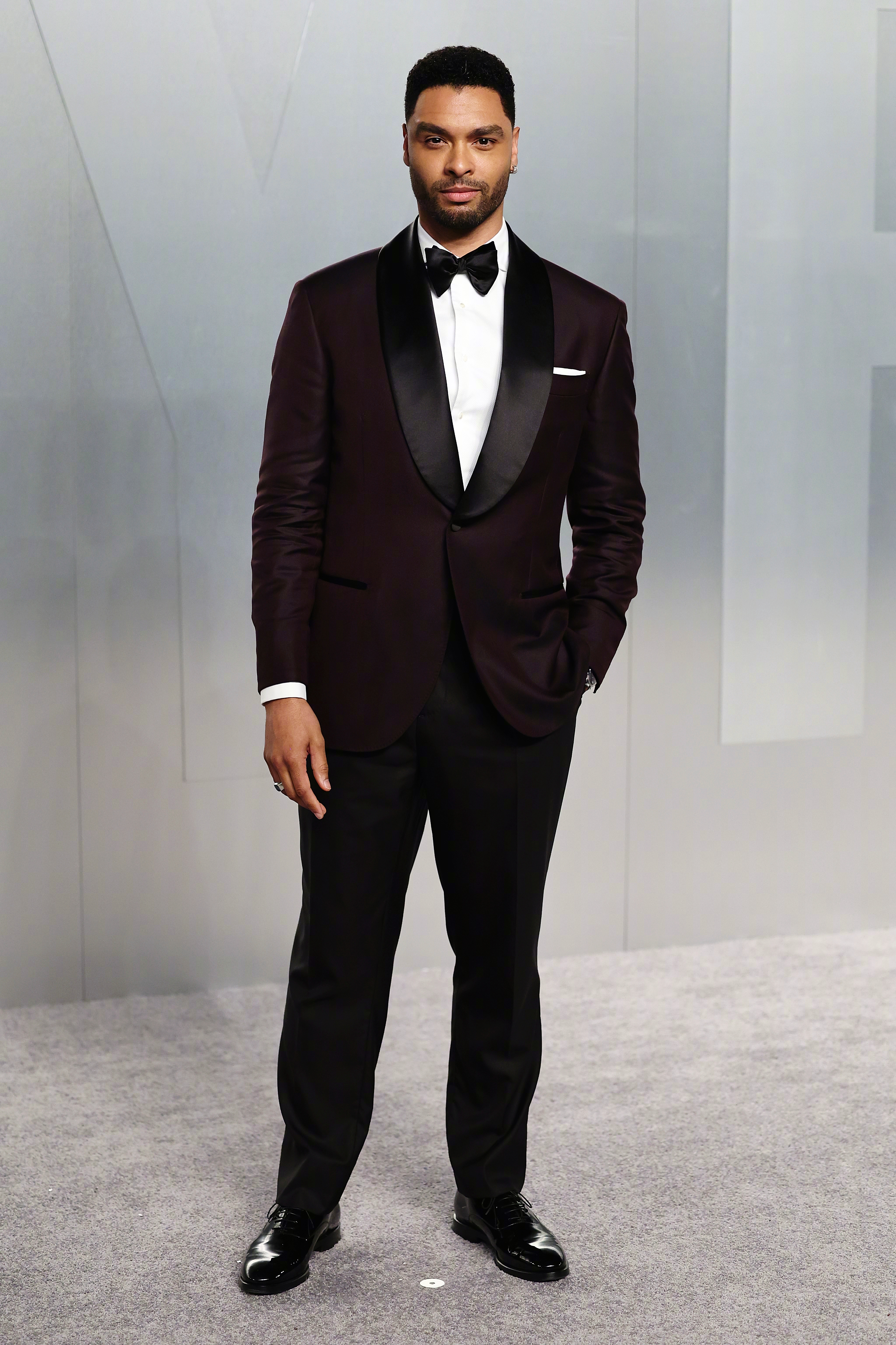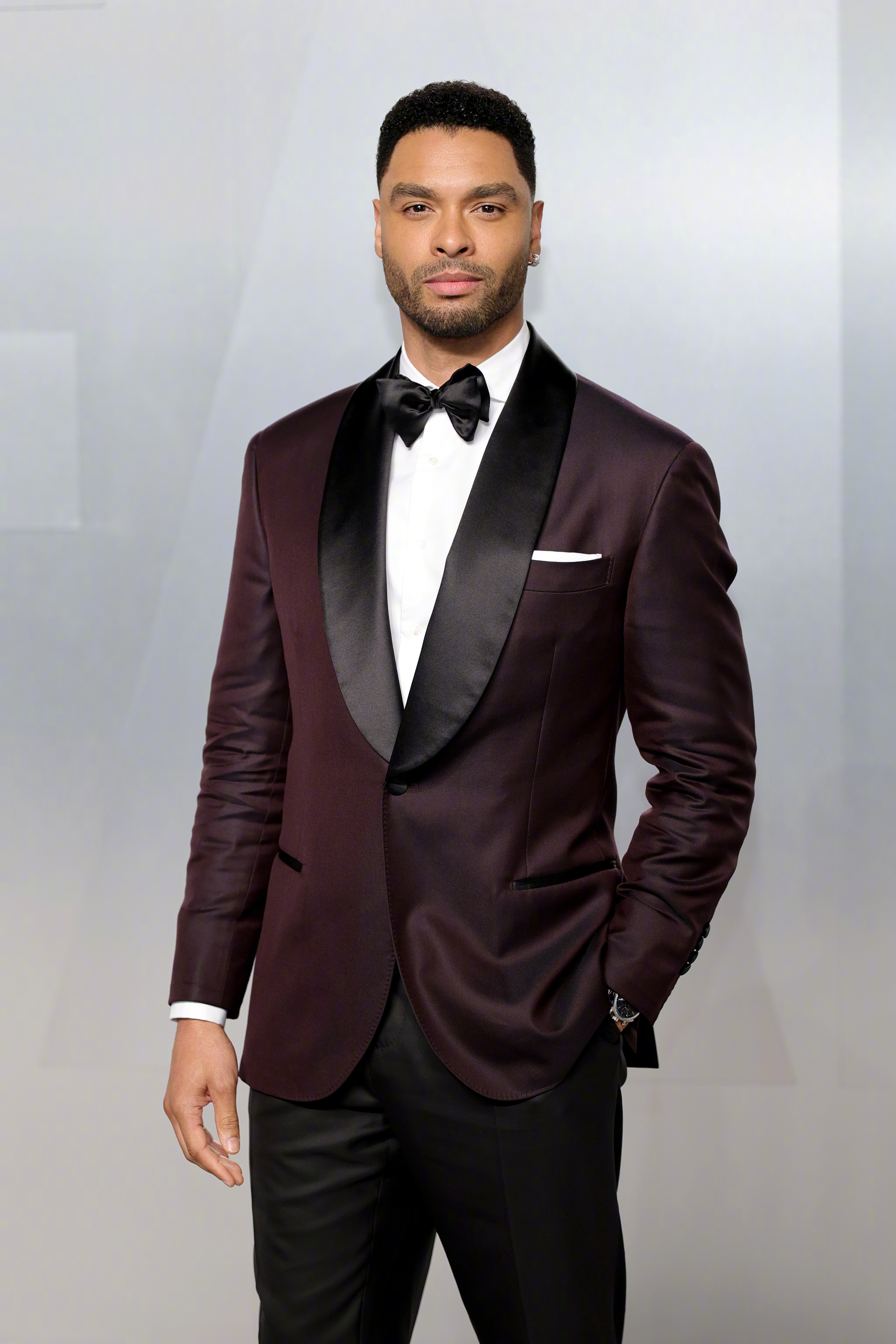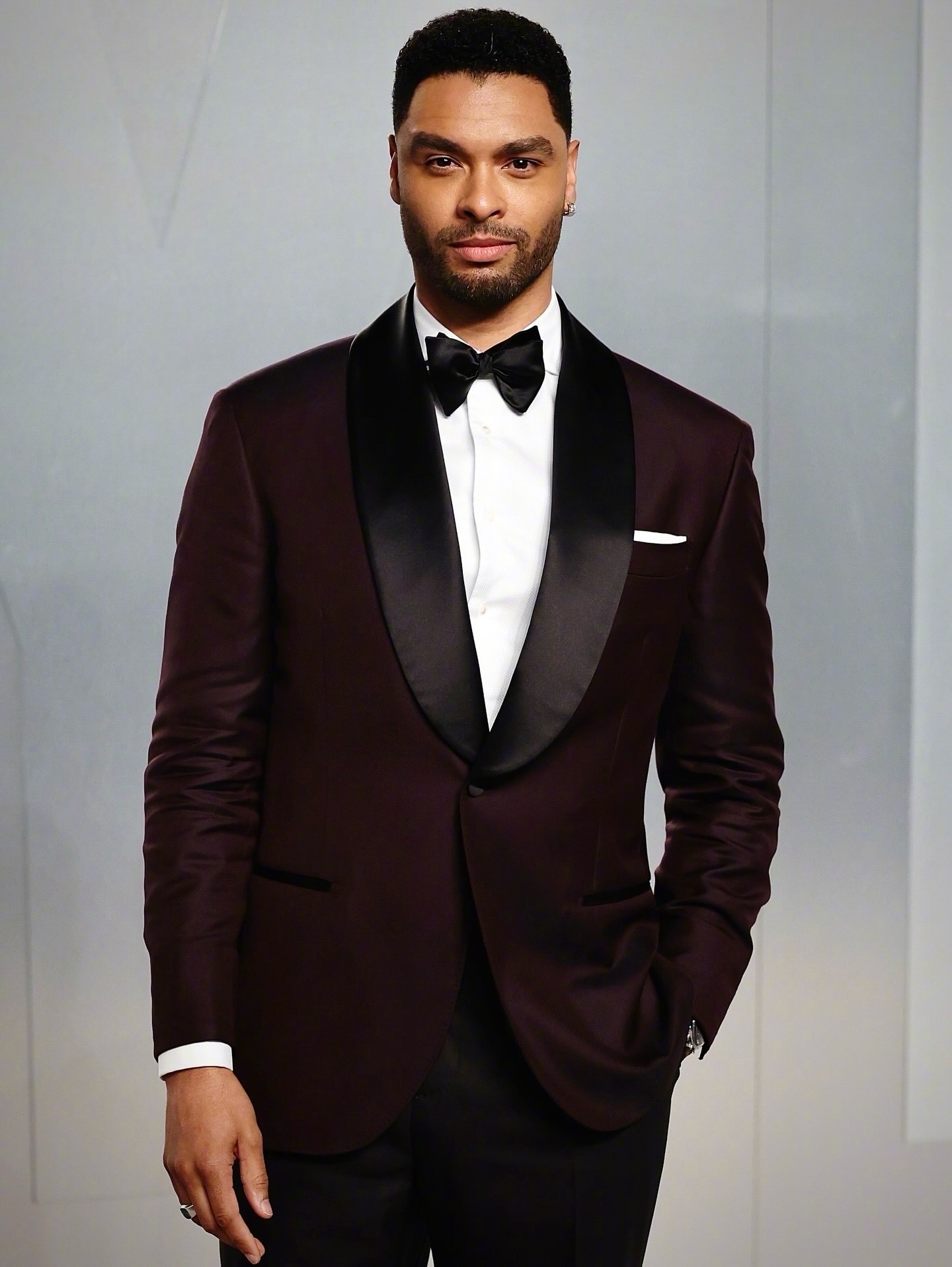 英国演员雷吉-让·佩吉(Regé-Jean Page)身穿Brunello Cucinelli礼服系列,深紫灰色真丝青果领礼服西装,搭配黑色礼服长裤及配饰,很适合他形象气质的礼服。米拉服饰解析