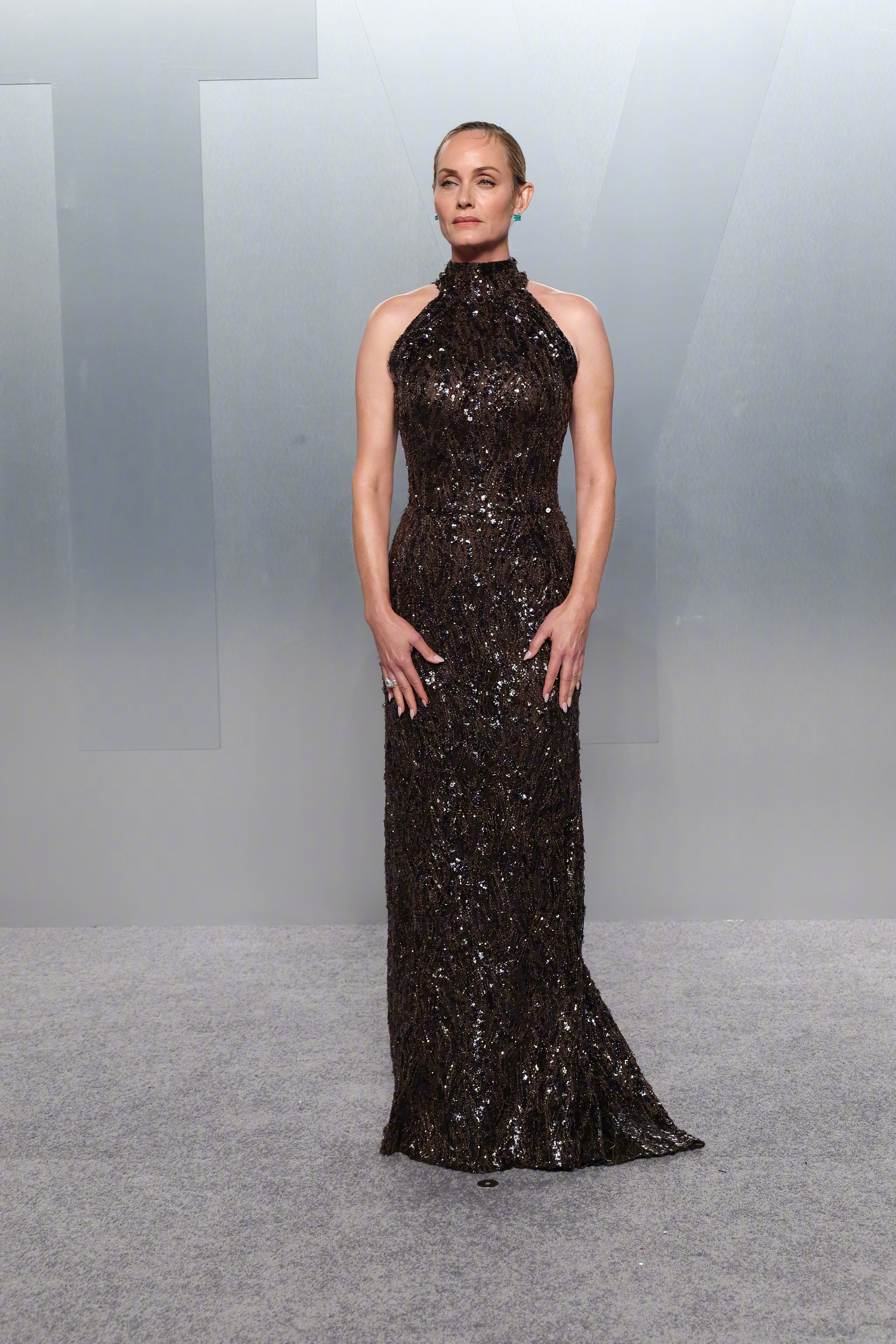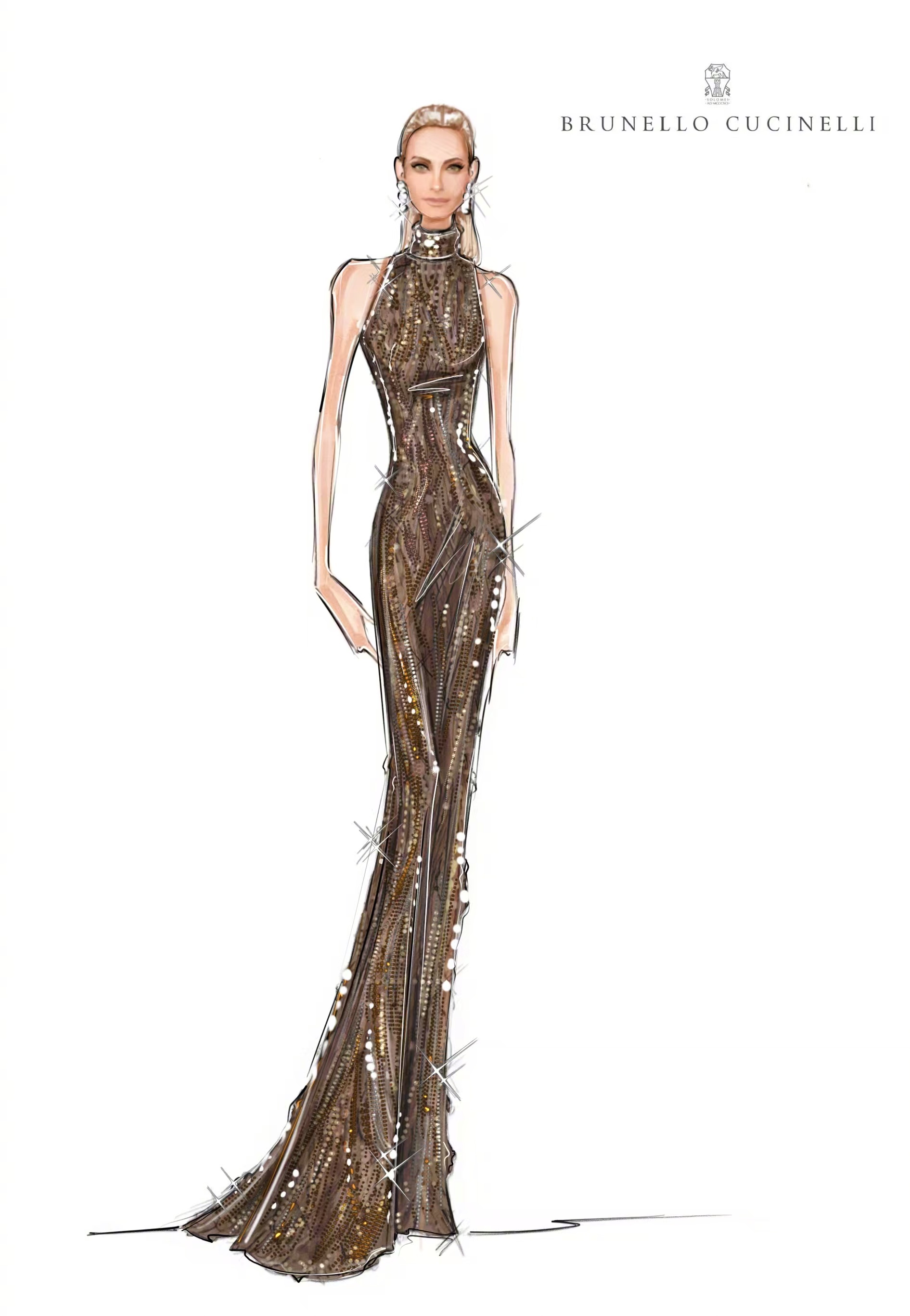 美国超模、演员Amber Valletta,身穿Brunello Cucinelli (Atelier Solomeo)特别定制巧克力棕璀璨星河手工刺绣礼裙,优雅又精致的造型。