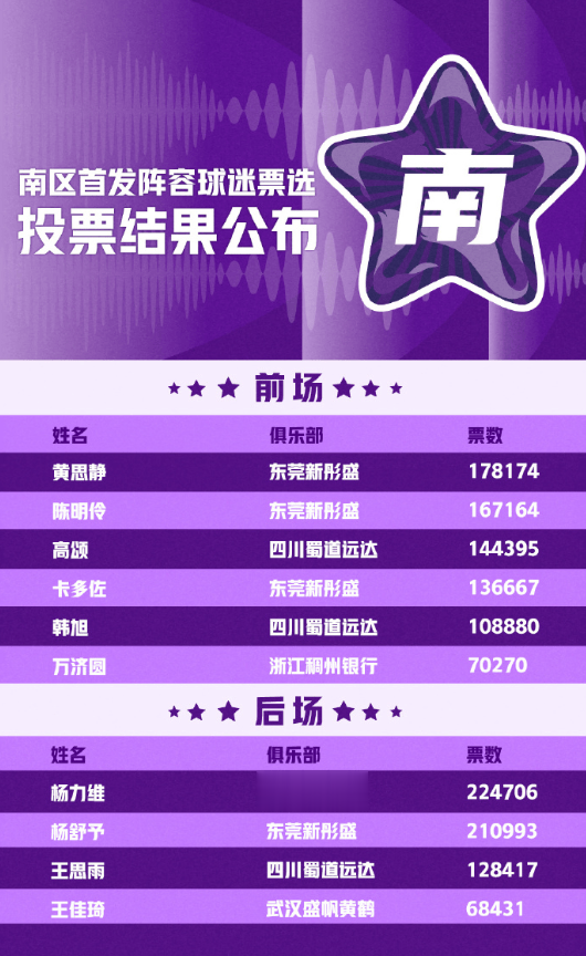 南区首发球员为:杨力维、杨舒予、黄思静、陈明伶(东莞新彤盛)、高颂(四川蜀道远达),杨力维以224706票成功当选票王!