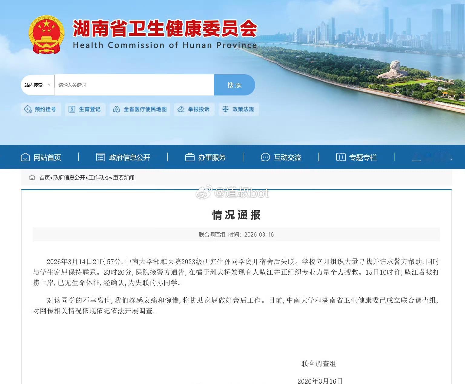 3月14日晚,湘雅医院2023级研究生孙同学失联,后在湘江被打捞上岸,已无生命体