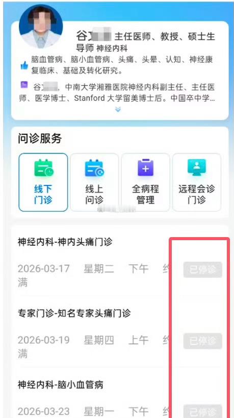 湘雅医院坠江身亡研究生的导师谷文萍已停诊。