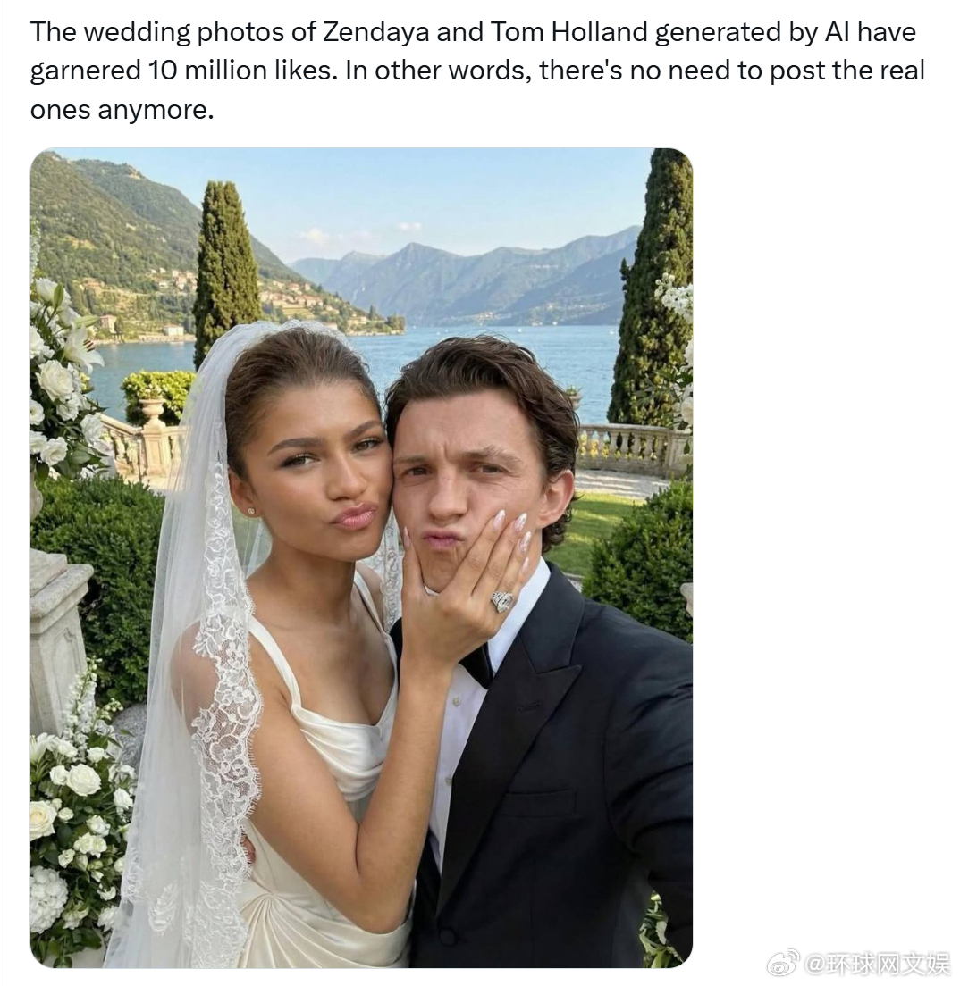 此外,节目中还提到了近几周在社交媒体上疯传的结婚照。赞达亚称:“好多人都被骗了。我现实中出门的时候,大家都跟我说‘天呐,你的结婚照也太美了’,我只能回‘亲爱的,那是 AI 做的,不是真的’。”赞达亚还透露,身边不少亲近的人也以为这些 AI 照片是真的,甚至因为没收到婚礼邀请而有点生气。