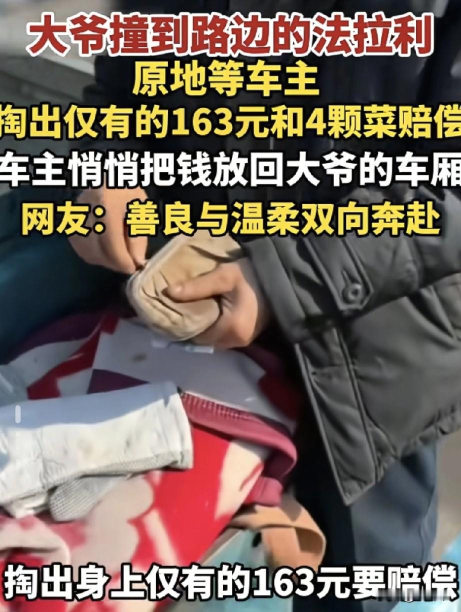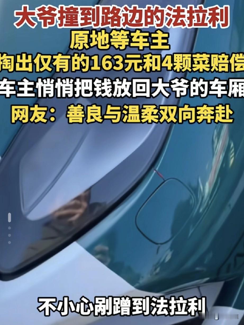 卖菜大爷骑三轮车撞上路边停放的法拉利,大爷等待车主到来后,车主表示不追究,但大爷仍要掏出身上仅有的163块钱和4颗白菜赔偿车主,车主假装收下后又把钱偷偷的塞到了大爷的车厢里,网友都说:“一个不逃避,一个不追究,这才是大爱”! 山东一位大爷骑着三轮车不小心刮到了一辆法拉利,他没有跑,而是原地等车主来,知道自己摊上大事了,车主到来后大爷把身上仅有的163块钱全掏了出来,又从车上拿下4棵自己种的橄榄菜,想赔给人家。 法拉利车主一看大爷这架势,心里挺不是滋味,压根没打算让他赔钱,为了让大爷安心离开,车主假装收下赔偿,等大爷骑上车后又悄悄把那163块钱塞回了三轮车里。 网友们纷纷点赞,有人说大爷的163块钱比啥都重,也有人夸车主格局大、心地善良,更多人感叹,一个讲诚信、一个懂体谅,这才是人间该有的样子!