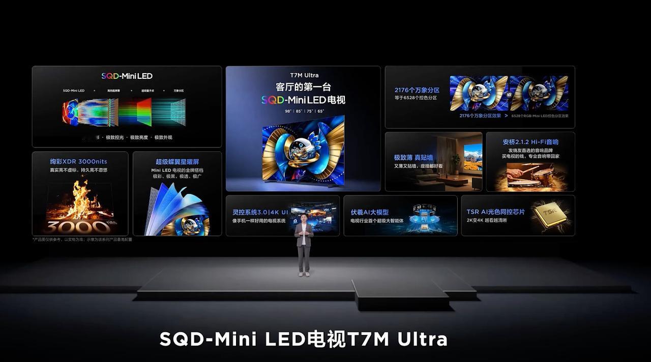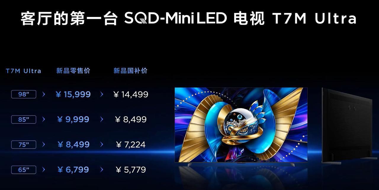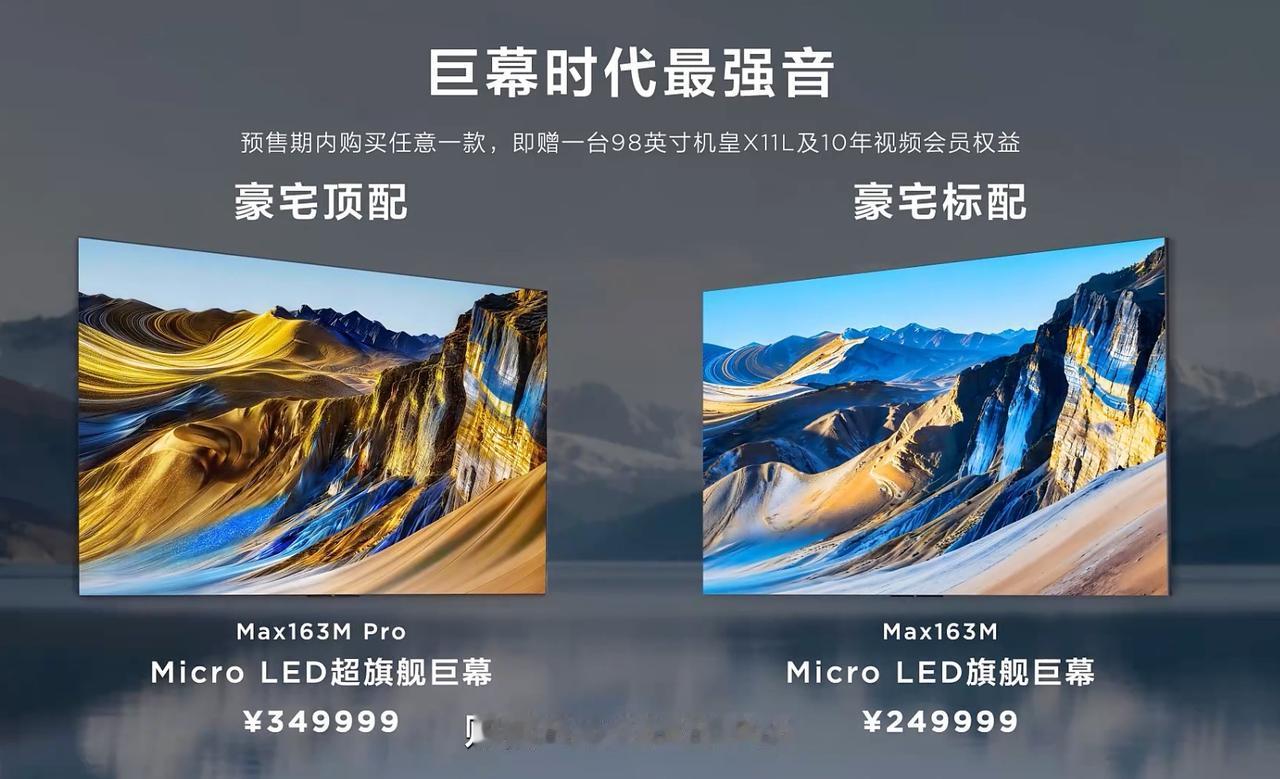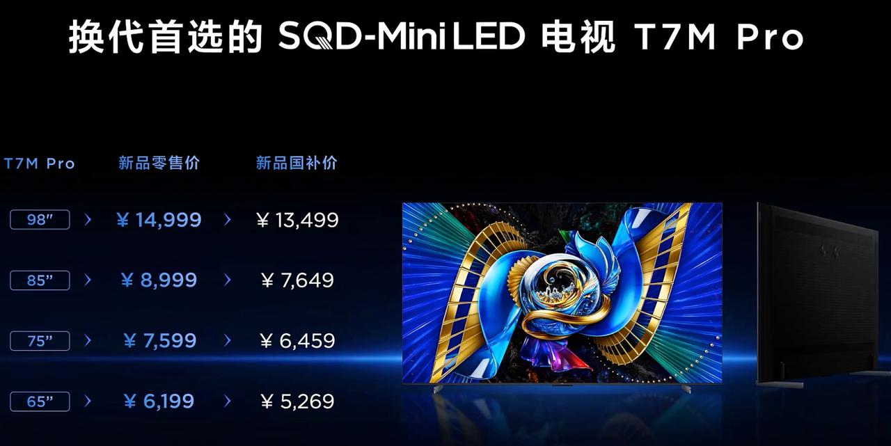 T7M Ultra,是T7L Ultra的升级版 100% BT.2020全局高色域,分区提升 超级蝶翼星曜屏,TSR AI光色同控芯片 4K+150hz刷新率,4GB+128GB 98英寸国补14499元 85英寸国补8499元 75英寸国补7224元 65英寸国补5779元 T7M Pro,是T7LPro的升级版 98英寸国补13499元 85英寸国补7649元 75英寸国补6459元 65英寸国补5269元 163英寸Micro LED巨幕电视发布 Max 163M Pro,售价349999元 Max 163M,售价249999元 预售期买任意一台,送一台98英寸X11L和10年会员