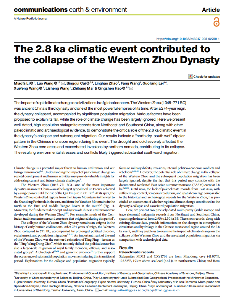 ² 中科院地质所利用两个不但是高精度,而且覆盖了公元前1000年-前550年的石笋记录,重建了西周灭亡前后的古气候环境。主要是当时的季风环流、区域水文演变。这里的石笋,是滴水里的碳酸钙沉淀形成的,包含了渗入的雨水信息。搞地球化学的人用铀钍定年技术可以反推当年的古气候环境。