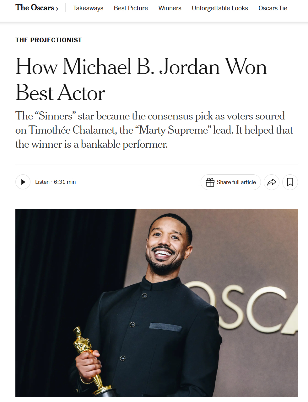 TNABO 《纽约时报》记者凯尔·布坎南分析:迈克尔·B·乔丹如何实现翻盘,能在四大风向标中只有演员工会支持的情况下夺得奥斯卡最佳男主角(历史头一次出现SAG自己捧出影帝),完成首提首中;以及前期呼声很强的提摩西·查拉梅为何到后期失去了学院的好感,并在投票几乎结束时的发酵争议中看到不满情绪爆发
