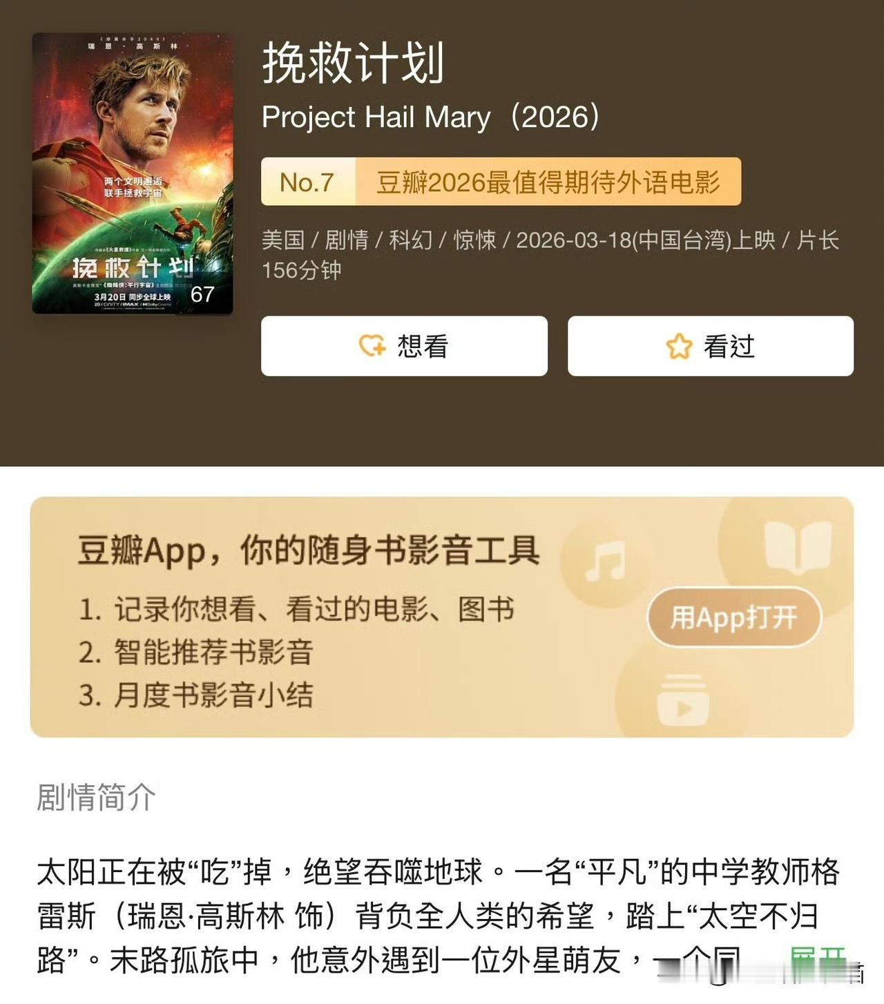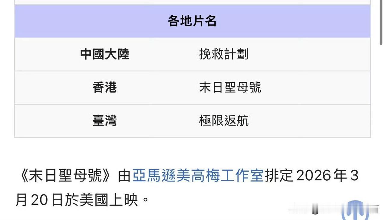 这好像是深深第三次为好莱坞大片(非动画)唱中文版主题曲了,前两次是《 触不可及》和《水形物语》,就是英文主题曲,深深也绝对没问题的。 深深声音里那股清冷又温暖的矛盾感,太适合这种宇宙漂流记了。要是哪天真给他唱英文版,那更是直接打通国际任督二脉,不管叫啥名,只要深深唱,这片子在我这儿就已经封神一半了! 顺便普一下大陆叫《挽救计划》,香港是《末日圣母号》,台湾叫《极限返航》。这三个名字放一起,简直能看出三地观众的口味差异。哈哈,大陆直给核心,香港偏爱戏剧张力,台湾则突出冒险燃感。 这都不重要,重点是深深唱主题曲这事,我单方面先信了!刚好踩在他音域里那种“孤寂中透着希望”的质感上。一起期待吧!