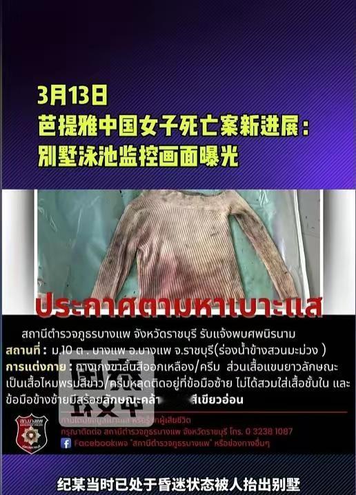 【确定凶手赵某】 国内女子季某,34岁 去泰国工作(娱乐陪玩) 2月20号傍晚,参加芭堤雅猜普勒路2巷的一处高档别墅。 “私人泳池派对”。 与派对中赵某(来自内地)十分融洽 2月21日凌晨,向朋友贾克发出六次呼救 2月21日上午,赵某驾驶从朋友借来车开始抛尸 贾克由于疏忽,六小时后才看见信息,联系季某 后来没办法,联系国内季某老公 2月23号老公来到泰国,向警察报案 2月25号才发现季某尸体 最终锁定赵某 开始通缉赵某 这位赵某劣迹斑斑,多次有绑架前科。