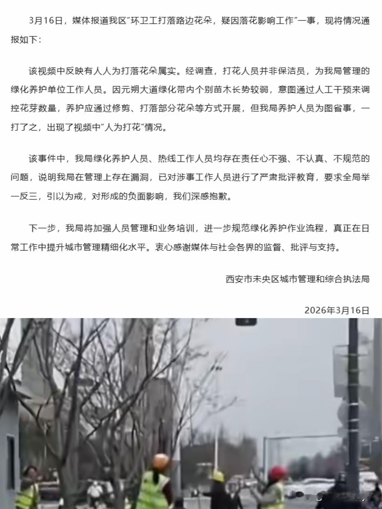 首先为西安城 管点赞! 有网友发现身着环卫马甲的人用长杆在马路上打落花瓣。 就举报到城 管局。 城 管回应:这不是环卫工人,是局绿色养护工作人员。 因该地区苗木长势弱,意图通过人工干预来调控, 应该分两步走: ①修剪养护 ②打落部分花朵 没想到工作人员为了省事,直接打落花朵。 已叫停,将调整考核办法! “花季打花”,确实有点煞风景, 但这已经不重要了。 重要的是西安城 管不推诿不扯皮, 敢于承担责任,保护弱势群体的做法就值得钦佩! 你说呢?