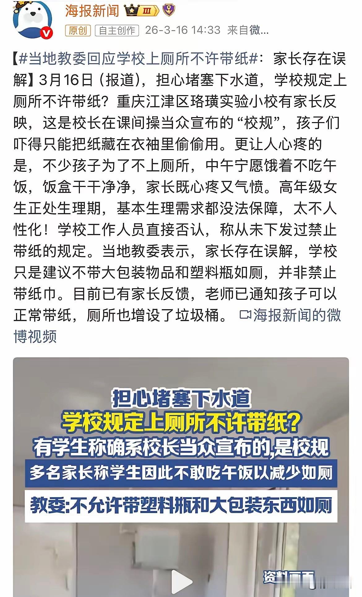 重庆一位家长晚上给孩子洗饭盒,发现饭盒干干净净的,中午根本没用过。孩子才上几天学,伙食费交了,饭却一口没吃。 这位家住江津区珞璜镇的妈妈攥着空饭盒,指尖都在发颤,饭盒里连一点菜汤都没剩,干净得晃眼。 她拉过刚写完作业的孩子,声音压得发紧:“中午怎么没吃饭?是菜不好吃吗?”孩子攥着衣角,头埋得低低的,半晌才嗫嚅着开口:“校长说上厕所不能带纸,我怕吃完饭要上厕所,就没敢打饭。” 这话像针一样扎进妈妈心里,她追问才知道,几天前的课间操上,校长站在主席台上,对着全校一千多名学生当众宣布,为了防止下水道堵塞,上厕所不许带纸,这是新定的校规,谁违反就要被批评。孩子怕得要命,连藏在书包里的便携纸巾都不敢拿出来,索性中午饿着肚子,连一口饭都没碰,就怕要跑厕所。 消息很快在家长群里炸开了锅,一条条消息跳出来,满是心疼和气愤。 有家长说,自家低年级的孩子把纸巾折成小方块,藏在衣袖里,趁没人的时候偷偷用,连大气都不敢喘;有家长晒出孩子的聊天记录,高年级的女生正赶上生理期,连最基本的生理需求都没法保障,只能忍着腹痛熬到放学,回家后抱着妈妈哭;还有家长说,孩子放学回家第一件事就是往厕所冲,连书包都来不及放,看着孩子苍白的脸,心里又酸又气。 面对家长们的质疑,学校工作人员一开始直接否认,称从未下发过禁止带纸的规定,说只是担心下水道堵塞,提醒过学生不要带大包装物品和塑料瓶进厕所。 可孩子们的说法高度一致,都说是校长在课间操的大喇叭里当众宣布的,是必须遵守的校规,这让家长们既气愤又无奈——明明是为了维护设施的管理,怎么就变成了折磨孩子的枷锁? 事情闹到当地教委,工作人员很快介入调查。几天后,教委给出回应,说家长们存在误解,学校原本只是建议学生不要带大包装物品和塑料瓶如厕,并非禁止带纸巾,是传达过程中出现了偏差,才让孩子们误以为连纸都不能带。回应里还提到,学校厕所此前多次堵塞,维修时发现管道里有不少杂物,才想着提醒学生注意,没想到话说重了,让孩子们产生了误会。 回应发出后没多久,就有家长反馈,老师已经在班里挨个通知,孩子们可以正常带纸进厕所,学校也连夜在每个隔间里增设了带盖垃圾桶,专门用来投放用过的纸巾,再也不用担心堵塞下水道的问题。 那位发现空饭盒的妈妈,当天晚上就给孩子准备了一小包便携纸巾,放进书包最显眼的位置,摸着孩子的头说:“以后不用再饿着肚子了,想吃饭就吃饭,想上厕所就上厕所。” 孩子看着手里的纸巾,眼睛亮了起来,第二天中午终于打了满满一盒饭,放学回家时,饭盒里只剩下干净的空碗,还跟妈妈说:“今天吃了红烧肉,老师说可以带纸,我再也不怕上厕所了。” 这件事里,学校担心下水道堵塞的初衷不难理解,可偏偏忘了最该放在心上的,是孩子们最基本的生理需求。 教育从来不是冷冰冰的规定,而是要站在孩子的角度,多一份共情和体谅。一句没传到位的规定,让一群孩子饿着肚子熬半天,让生理期的女生忍着不适,这背后藏着的,是学校管理的僵化,也是对孩子最朴素的关怀的缺失。 好在事情最终得到了整改,可这件事也给所有学校提了醒,再小的规定,都要先想想会不会影响孩子的正常生活,别让所谓的“管理”,变成伤害孩子的利刃。教育的温度,从来都藏在这些细碎的关怀里,只有把孩子的感受放在第一位,才能让他们安心成长。 各位读者你们怎么看?欢迎在评论区讨论。