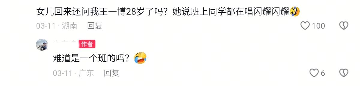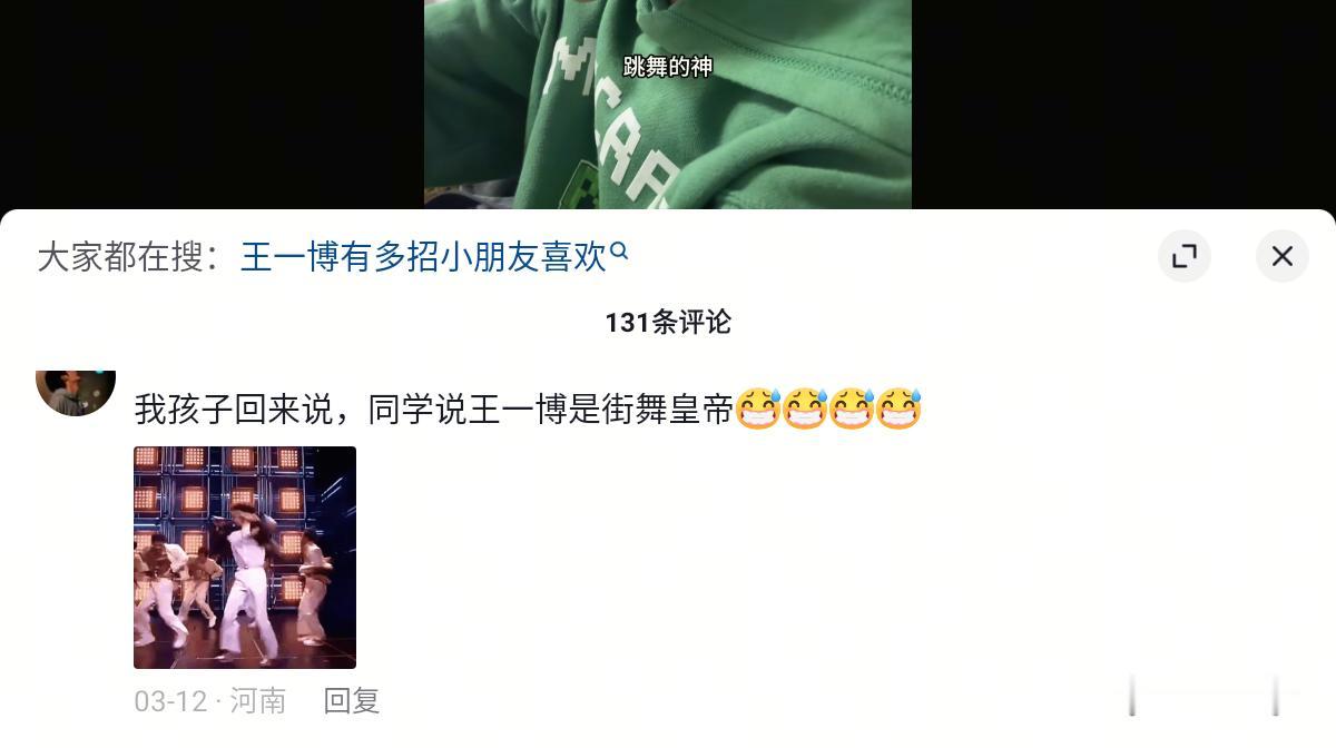 王一博的《闪耀动起来》特别招小朋友喜欢。都不知道小学生怎么那么爱“闪耀闪耀”,感觉跟以前他们人人都会唱孤勇者一样,就莫名很对小学生的口味。 刷到一位小学生,他妈问他为什么他的同学们都喜欢王一博,小男生的回答惊到我了,“他是舞神,跳舞的神”! 还有评论说,小同学说王一博是街舞皇帝! 玛耶[大笑] ,小朋友们直接封神封帝。 春晚那天晚上就刷到很多小宝宝看着节目就跟着手舞足蹈的。现在春节都过去那么久了,仍然能刷到很多宝宝在跳这支舞。 其中有个上幼儿园的小男孩,没学过舞的,天天看着电视跟着王一博跳,很认真地练舞,乐感还不错。这真的太令人惊讶了!十年二十年后,或许会有人谈起改变人生的一位偶像就是王一博。