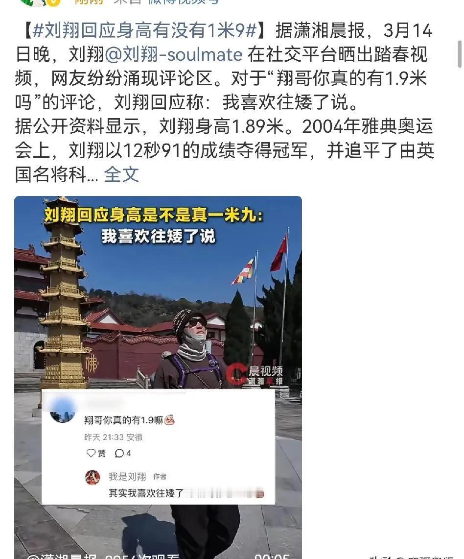 “翔哥你真的有1米9吗? ”面对网友的“灵魂拷问”,退役多年的刘翔,最近在一则踏春视频下,幽默回应:“其实我喜欢往矮了说,相对你也知道。 ”这条回复,比他散步寺庙的松弛背影更吸睛,瞬间把这位昔日田径飞人送上热搜。 官方资料摆着,刘翔身高1米89。这种自曝“谎报”的机智,并非哗众取宠,而是把一个奥运冠军,瞬间拉回到你我身边的普通人。 从赛场上毫厘必争的精确,到生活里“矮了说”的豁达,这反差,透着一股经历风浪后的真性情。 他没去喧嚣的娱乐圈,也没把自己锁在田径圈,而是担任体局副主任,兼顾政协委员,甚至跨界时尚圈,被称“被田径耽误的超模”。 刘翔的故事,早就不是“飞人”二字能概括的。 一个曾背负整个国家期望的顶尖运动员,在职业生涯最高光与最低谷时,都曾被舆论架在火上烤。 如今,他不再需要用金牌证明价值,也不必活在万众瞩目的滤镜下。 选择低调,选择自在,在不同领域摸索,在平凡生活中找乐子。 这不正是很多人苦苦追求的——卸下重担,为自己而活吗? 所以,当你功成名就,面对“盛名”与“自由”,你会选择前者,还是后者?